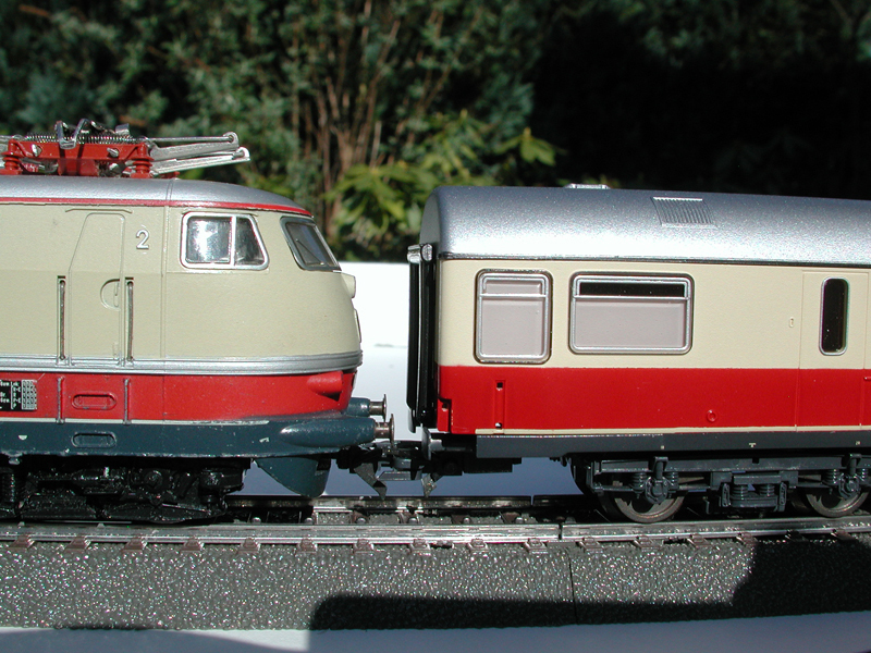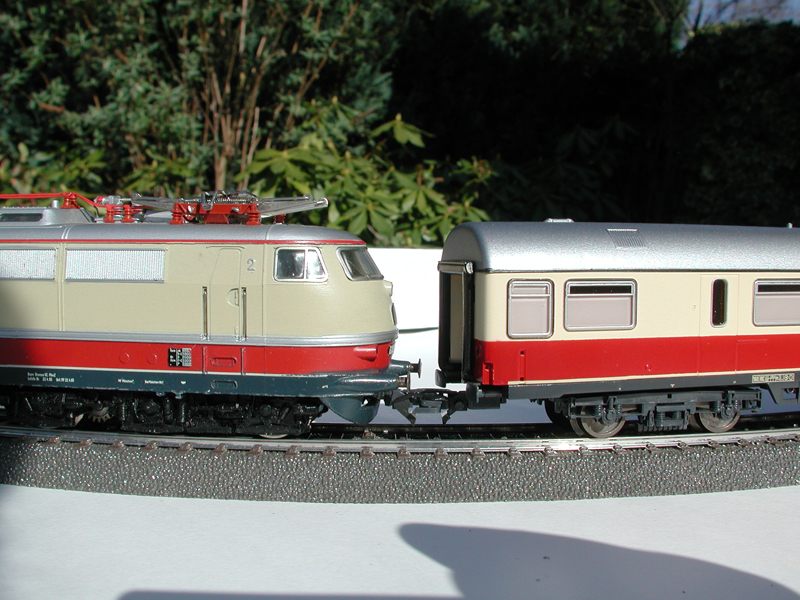Danke für das Lob! ops: Der schöne Anblick mit dem kurzen Abstand Lok-Wagen macht wirklich Freude. Meine neueste 103, die 103 109-5 von Trix hat nicht nur den Umbau auf Märklin sondern auch schon den Adaptertausch hinter sich. Die macht sich vor einem schönen TEE (oder nicht ganz der Lackierung entsprechend auch IC, je nach dem ob auch Wagen der zweiten Klasse im Zug sind,) richtig gut.