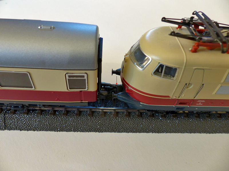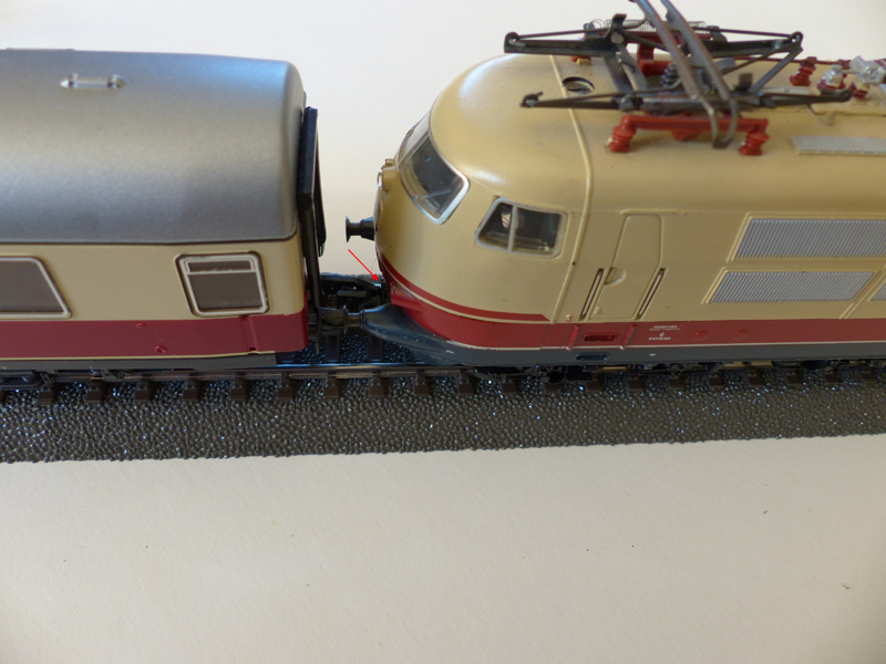 jetzt mit meinem Adapter. Auch hier zielt der rote Pfeil auf die vordere Front des Adapters. Da ist der Lok-Wagen-Abstand fast 2 mm kürzer geworden. Das wollte ich dann natürlich auch an meiner BR 103!