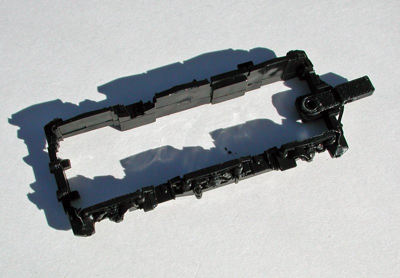 Hier sind der alte und der neue Drehgestellrahmen mal im Vergleich. Bei dem alten (im Vordergrund) sind die Federn für die Rückstellung der Kupplungen zu sehen.