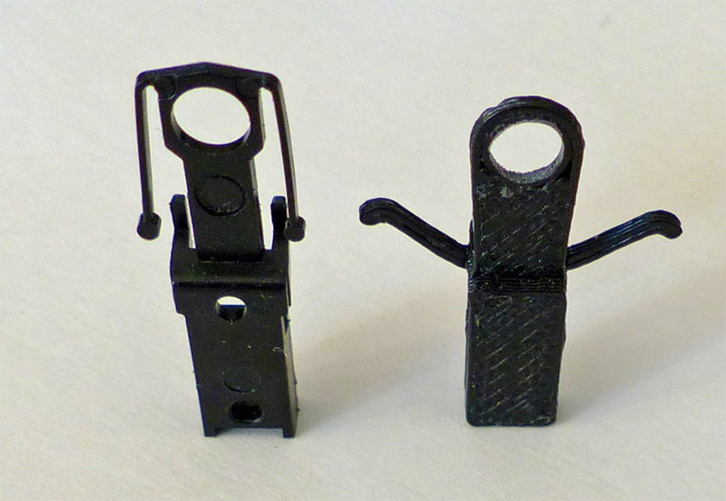 Das ist dann im Vergleich der original Märklin Adapter und meine dritte Versiond des Adapters für die BR 103 / E03. Ich habe an den neuen Adapter zwei Federn für die Rückstellung konstruiert und die Aufhängung für die Höhenjustage eingearbeitet.