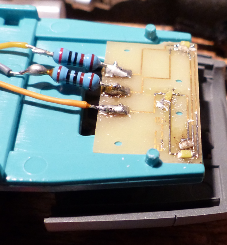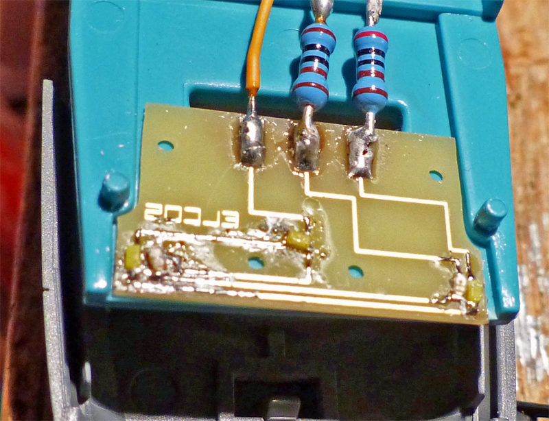 die Kabel wieder angelötet. Erfolg denkste die LED leuchtete nicht. Piko Ingineure hatten eine Elektronik eingesetzt die die gelben LED nur mit 0,9 Volt zu betreiben. Also die Platine ausgebaut und die gesammte Elektronike entfernt und 2 neue SMD Widerstände von 22kOhm eingelötet damit leuchten die warmweißen Nicht so grell.