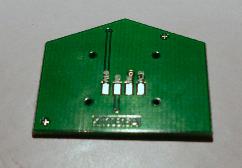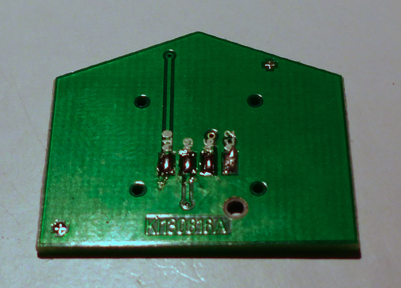 Beim Testen des frisch programmierten Decoders am ESU-Prüfstand ist mir dann aufgefallen, dass die Nummerntafeln normal gleich hell leuchten, wenn aber das Horn ausgelöst wird, dann fangen die Nummerntafeln an, die Helleigkeit zu variieren (Funktion Ditch-Light mit vertauschten Phasen). Um das auch mit der Märklin Platine zu realisieren, müssen die beiden äußeren LEDs voneinander getrennt werden. Dazu habe ich an geeigneter Stelle ein Loch in die Platine gebohrt.
