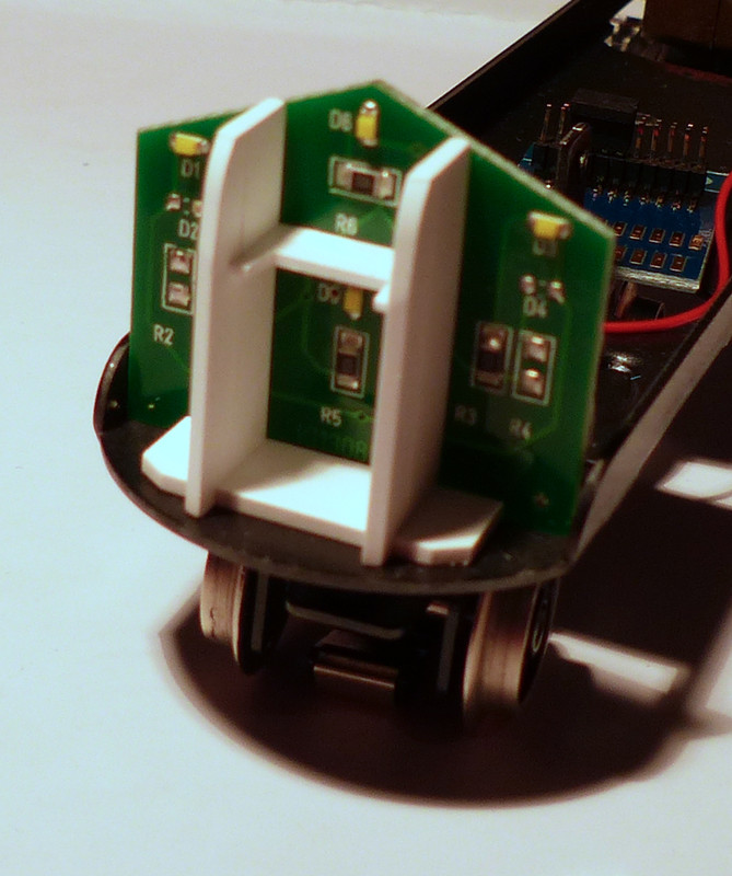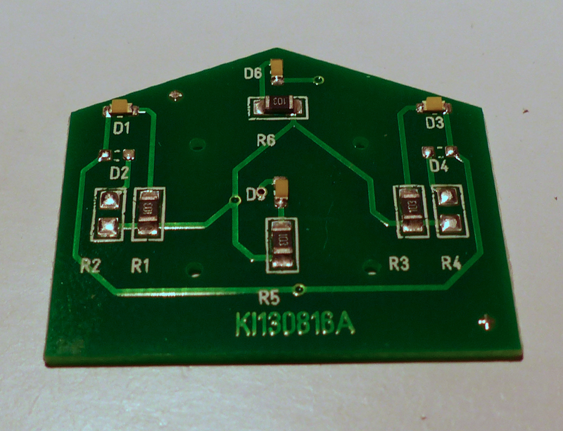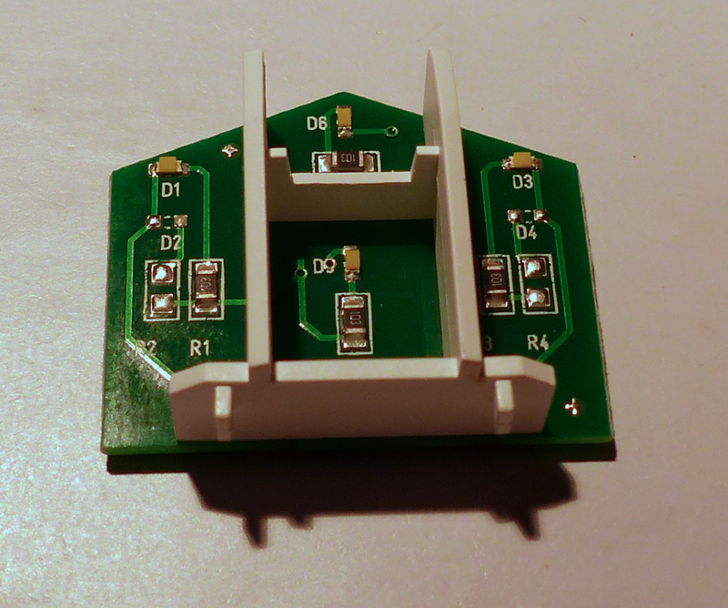 ... und von vorne. Die mittig obere LED ist das Gyra-Light, die mittig untere die normale Beleuchtung. Die beiden seitlichen LEDs sind parallel geschaltet und für die Beleuchtung der Nummerntafeln und, falls vorhanden, der Positionslichter classification lights [Danke an Nils] oberhalb der Nummerntafeln.