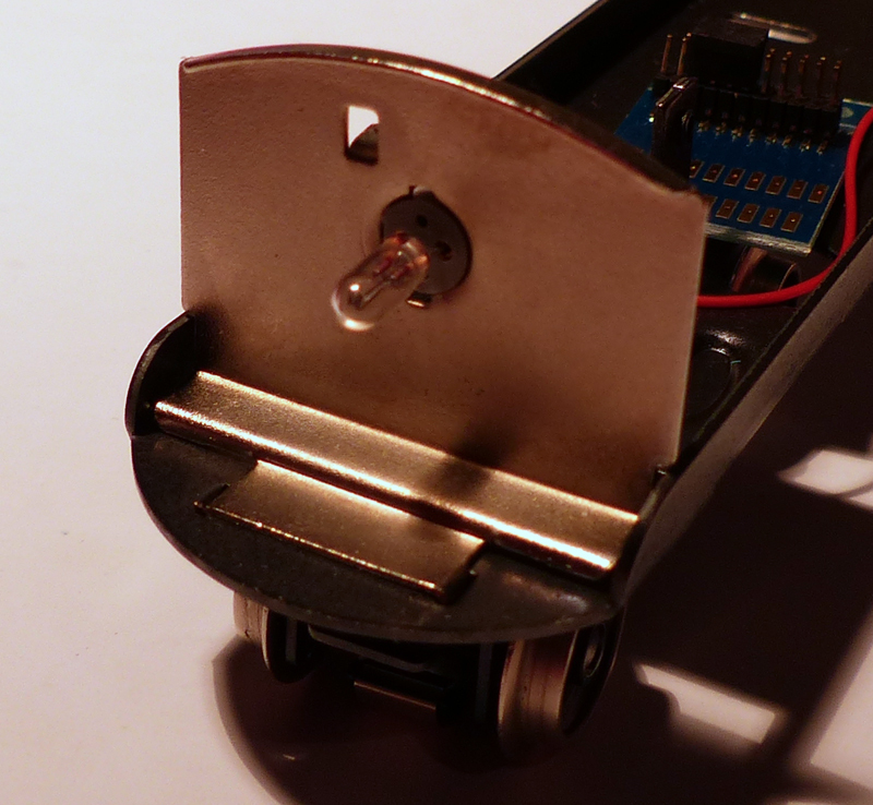 Zum Trennen der beleuchteten Elemente hat Märklin freundlicher Weise eine passgenaue Blende beigelegt, die auch gleichzeitig zur Befestigung der Platine am Chassis dient.