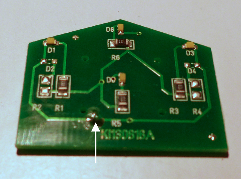 An der Spitze des weißen Pfeils kommt die Bohrung heraus. Sie hat die Leiterbahn zur linken LED aufgetrennt. Dann habe ich den Schutzlack der Leiterbahn etwas abekratzt und dadurch gleich einen neuen Kontaktpunkt zum Anlöten des neuen Kabels erhalten.