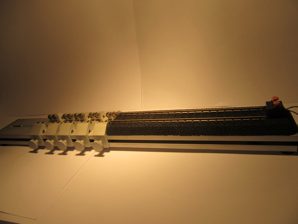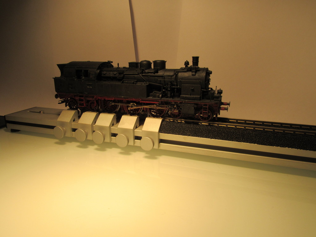 Die fünf Rollensätze sind leicht verstellbar und praktisch jede Maschine kann dort laufen. Ein Stück festes Gleis dient zur Aufnahme des nicht gtriebenen Teils einer Lok.