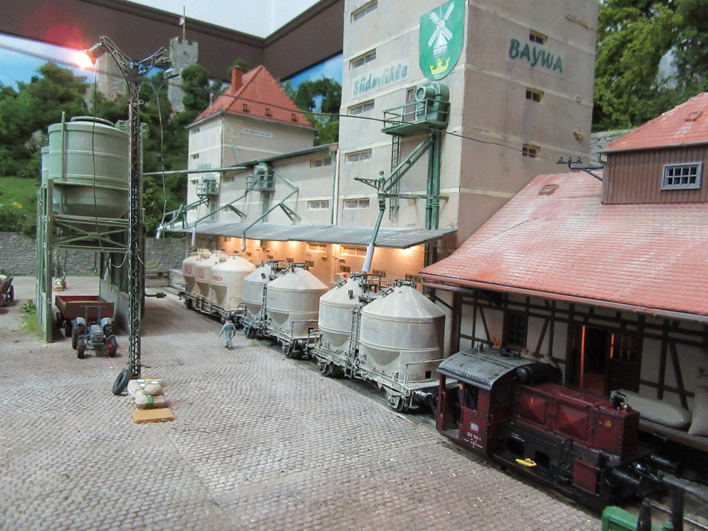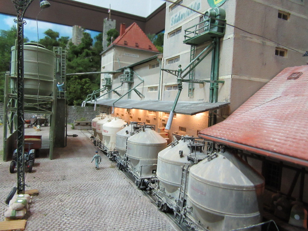 Eigentlich ist sie noch nicht dran…doch die letzten Fotos des großen Getreidewagens haben mich ermuntert das doch vor zu ziehen. Einiges gefiel mir nicht an der Mühle. So wollte ich schon seit langem ein durchgehendes Vordach über der Rampe haben. Dieses ist nun endlich da. Des Weiteren wurden fehlende Regenrinnen angebracht. Die Dachflächen wurden farblich nachbehandelt ,weil mir das ursprüngliche Grau zu hell war. Weiterhin wollte ich mehr Rohre ,Gebläse und Technik, Fördertechnik eben die Getreide und Mehl transportiert und verlädt. Auch hier habe ich einiges verändert. Schlussendlich hat die Rampe endlich Licht bekommen. Die Mühle hat nun für mich mehr von dem Charakter eines großen Industriegebäudes mit seinen verwirrenden Leitungen und Rohren und hohen Gebäuden,zwischen denen die Waggons fast schon klein und wie Spielzeug aussehen...........sind sie ja schließlich auch !!!!!