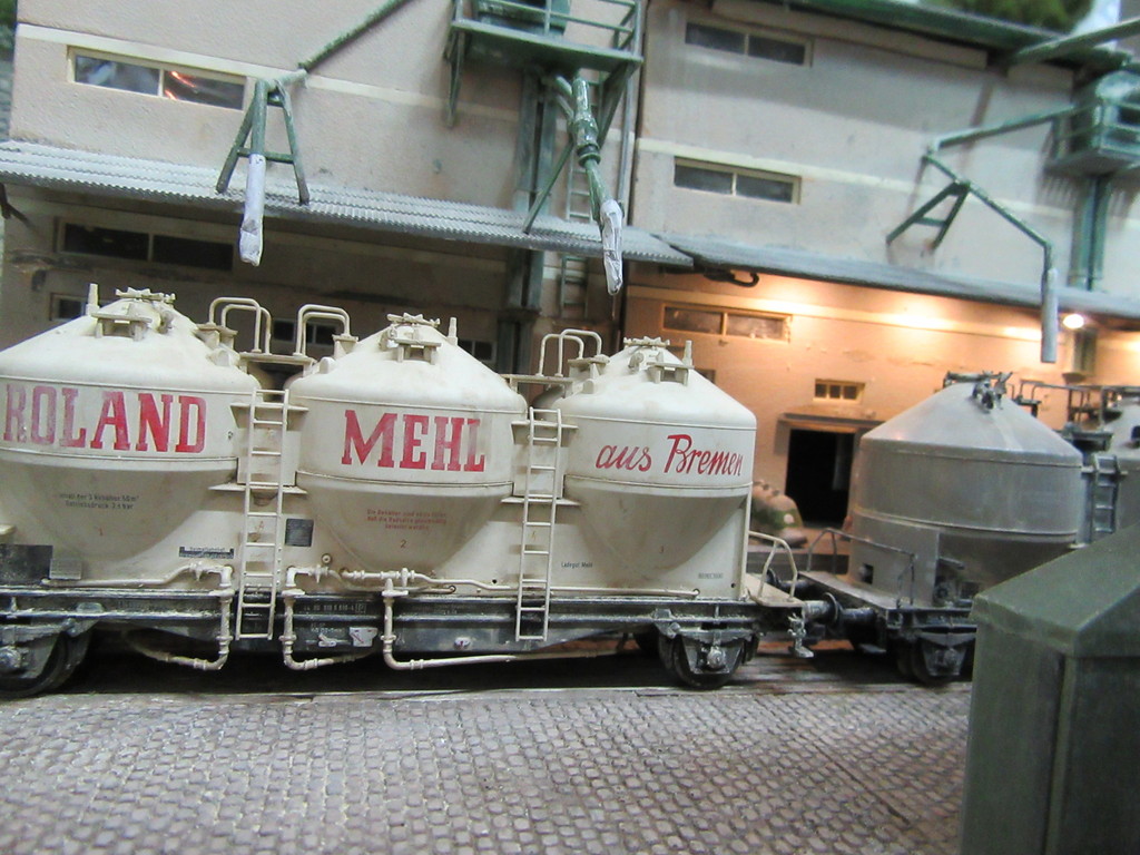 Die Mühle wird noch etwas verändert und verbessert werden,was ich ja hier schon begonnen habe ,wie Du siehst. Einige Dinge gefallen mir noch nicht . Aber das braucht noch ein wenig Zeit. Freue mich das Dir die Getreide und Silowagen gefallen. Dann wird Dir der nächste Wagen ganz sicher auch zusagen. War gestern auf einer Börse in Wesel am Rhein. Dort gab es einen KDS 67 von Piko. Jetzt ist es so das dieser Wagen beim Vorbild erst um 1960 kam und somit ein klein wenig spät ist für die Zeit in Neustadt, doch da bemühe ich dann immer gerne den Effekt der Einsteinschen Zeitverzerrung, den Ihr sicher kennt und mich kennt Ihr ja auch……lach. Ich konnte dieses herrliche Modell nicht gehen lassen und habe es bereits „vermehlt“ . Es muß sich um einen der ersten Versuchswagen handeln….Augen kneif…die damals schon neben den KDS 54 und 56 in Dienst waren ;hier für die BREMER Roland Mühle . Die Neustädter Südmühle übernimmt schon mal Aufträge für die Bremer Kollegen und so ist es wohl zu sehen ,das am 10.3.1959 so ein Wagen schon als Versuchswagen Futtermehl mit einigen zweiachsigen KDS Kollegen an der Südmühle übernimmt.