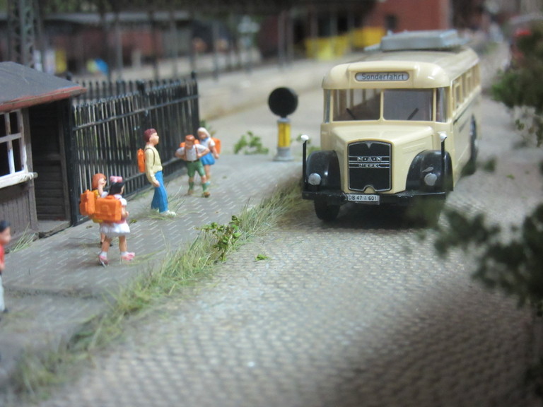 Im Vordergrund ist der Bus eingetroffen ,der die mit dem letzten Schienenbus eingetroffenen Schulkinder weiterbefördern wird.