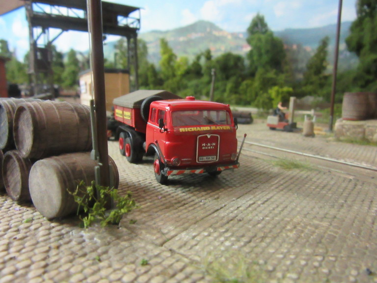 Aber auch am Güterbahnhof tut sich wieder etwas......Die Spedition Richard Mayer hat den Auftrag bekommen einen MAN Motor auf die Bahn zu verfrachten. Mayer besitzt bereits den flammneuen MAN 23.210 BFS. Dieses FZG erschien am Schluß der 1950er Jahre und ist im Rahmen der bekannten Einsteinschen Zeitverzerrung hier zu sehen Die Pausbacke drückt vorsichtig den schweren schon ab 1953 gebauten Scheuerle Tieflader unter den Kran. Die weitere Ladeszene mit dem Eintreffen des Bahntiefladers sehen Sie demnächst in diesem Kino....
