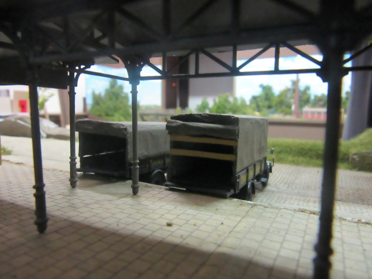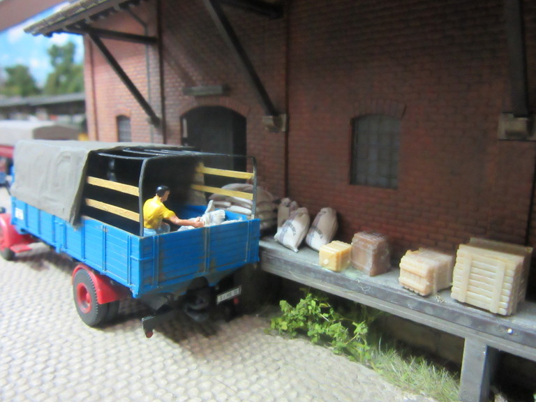 so ähnlich soll es dann mal aussehen mit Beleuchtung natürlich und "Männekens" die ordentlich laden von der "Waggonseite" in die "LKW-Seite".Die kleinere Plane links ist ein erster Versuch.Weiß noch nicht ob ich da auch eine höhere baue???....was meint Ihr?