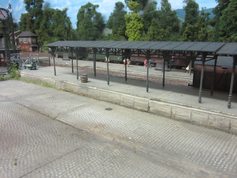 Der Güterbereich bereitet mir noch Kopfzerbrechen. Ich weiß noch nicht recht wie ich das Ladebahnsteigdach vernünftig auf dem Gipsbahnsteig fest bekomme. Natürlich könnte man bohren mit dem Bohrzwerg. Es besteht dann die Gefahr des Ausbrechens von Gipsstücken. Gesetzt den Fall das es gut geht würde man die dünnen Füßchen des Bahnsteigdaches dort mit Weißleim festmachen ,was auch muß denn diese Bahnsteigdach ist wie eine Gummibanane und will immer irgendwo nicht aufliegen.