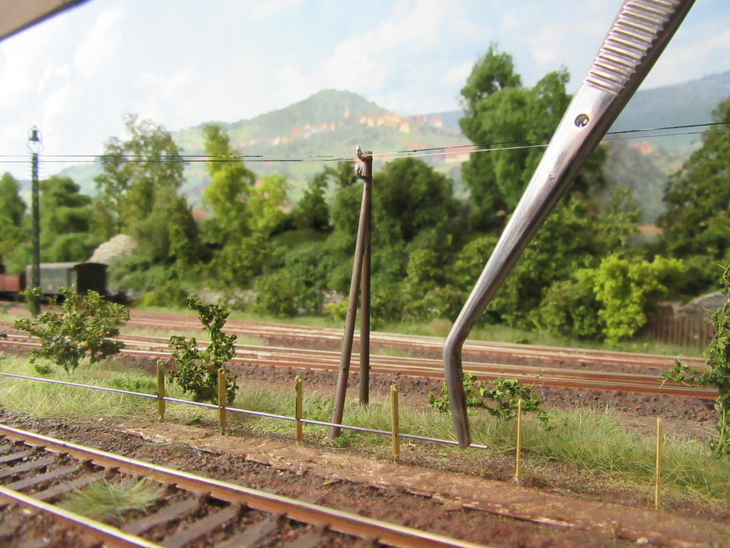 Noch einige Worte zum Aufstellen des Zauns. So wie von Karl Heinz beschrieben geht es zwar auch, aber noch simpler wird die Sache wenn man anstatt dem viel zu starren Draht z.B. schwarze Decoderlitze durchfädelt. Geht super einfach direkt vor Ort nach dem vorherigen Setzen der Zaunpfosten.
