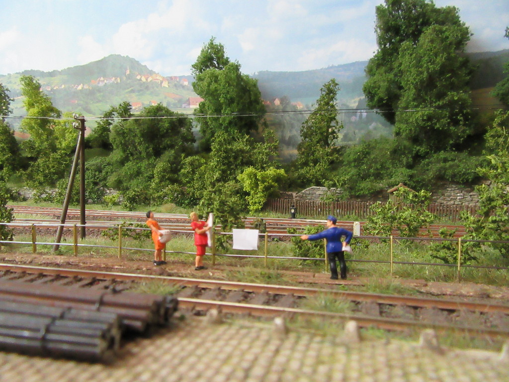 Der Zaun ist von Heki wie Richard (Guppy) schon gepostet hatte (Nr6520). Allerdings habe ich die Drähte die dort in der Packung sind nicht benutzt. Diese sind 0,8mm dick und recht kurz. Ich habe mir das zunächst angeschaut und bin dann aber dem zuvor erhaltenen Tipp von Karl Heinz gefolgt und habe mich nach anderem längeren und formstabilerem Federstahldraht umgeschaut. Dieser wurde in 1 m Stücken beschafft und weißt lediglich eine Dicke von 0,6 mm auf. Das wirkt feiner und ist umgerechnet immerhin noch ein Rohr von 52mm. Dieser Draht läßt sich sehr gut mit einer Spitzpinzette einführen. Die Pfosten habe ich am Tage zuvor eingesetzt und geklebt. Benutzt man ein kleines Tröpfchen Pattex oder ähnliches werden sie relativ fest,sind aber immer noch etwas beweglich und lassen sich so in ihrer Lage korrigieren. Zu perfekt sollte der Zaun auch nicht werden. Da darf ruhig mal ein Pfosten etwas krumm stehen etc, wie bei einem älteren Zaun eben üblich. Die Farbgebung erfolgte mit verdünnter Acrylfarbe von Anita Decor. Rostspuren wurden mit dem Farbkasten angebracht. Allerdings gefällt mir die braune Farbgebung von Richard auch sehr gut. Mal sehen ...brauche ja noch mehr Zaun.