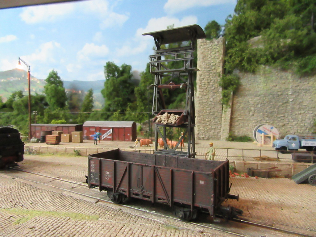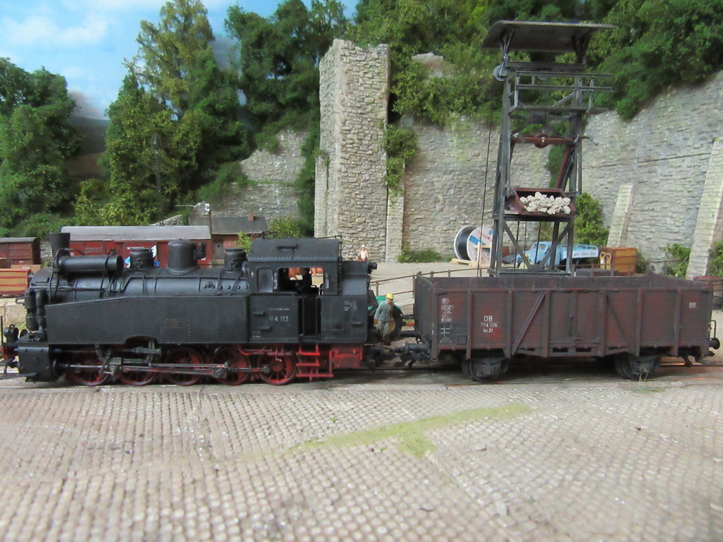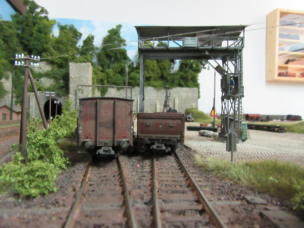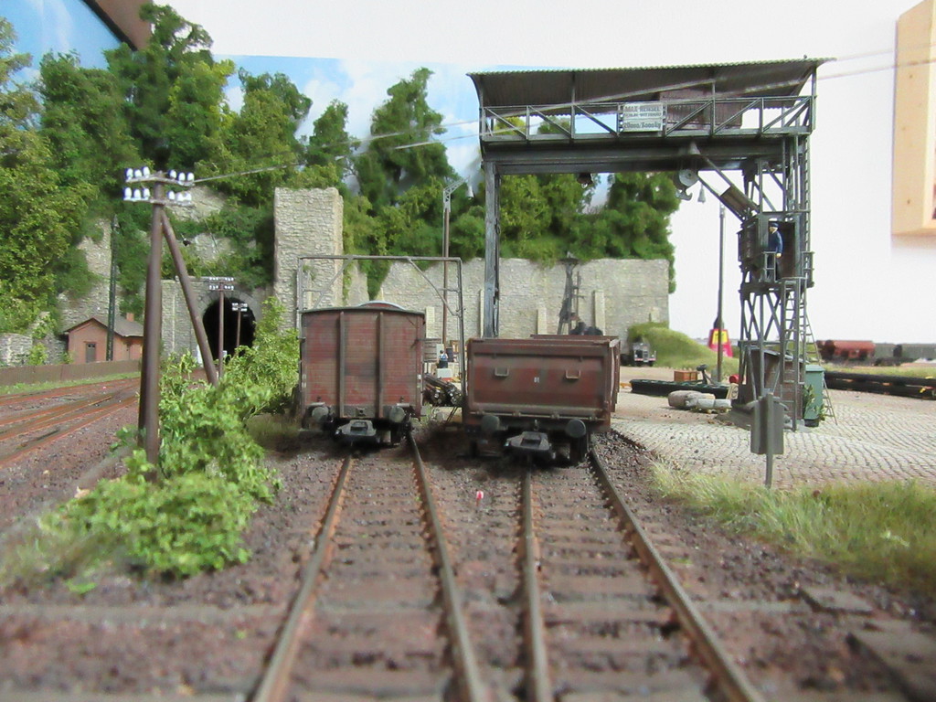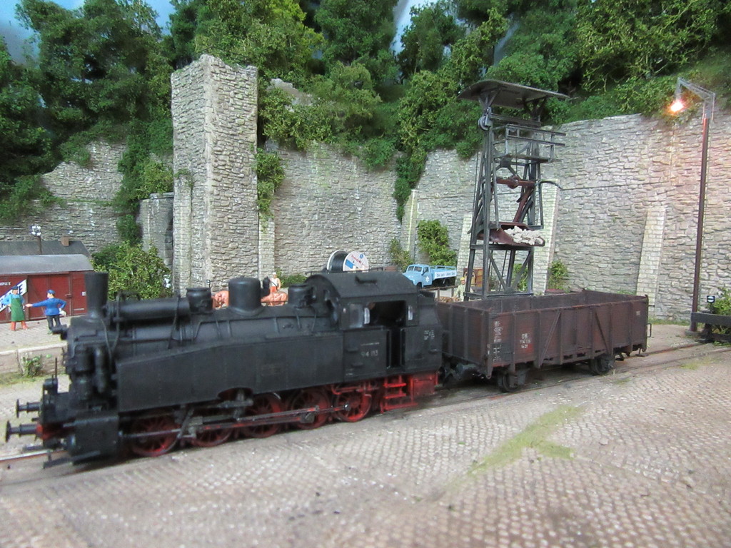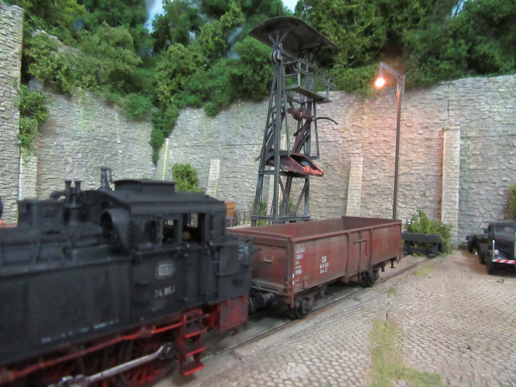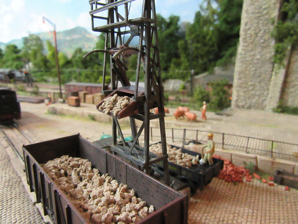 Im kleinen Maschinenhaus links befindet sich eine elektrisch betriebene Winde die den Kübel hochzieht, bis er aufgrund der „Gleisführung“ am Schräggerüst überkippt und seine Ladung auf den Waggon entleert. Der Rücklauf des Kübels erfolgt aufgrund des Eigengewichts und des Nachlassens des seile an der Winde. (Der Faden unter dem Kübel ist im Wirklichkeit wohl nicht erforderlich)