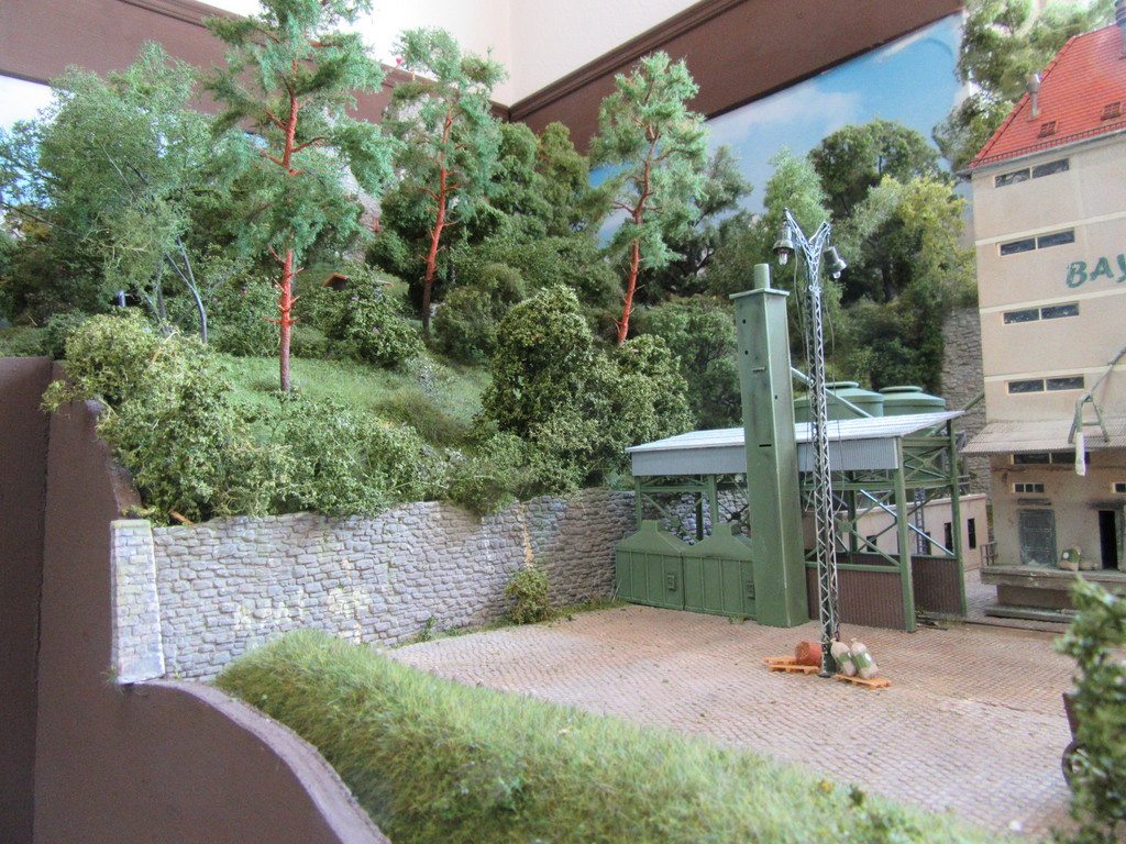 C2 vorne links die Anlieferstelle wegen der das Gleis noch verlängert wird. Der Blick auf den Wald und die Burg bleibt bei C frei