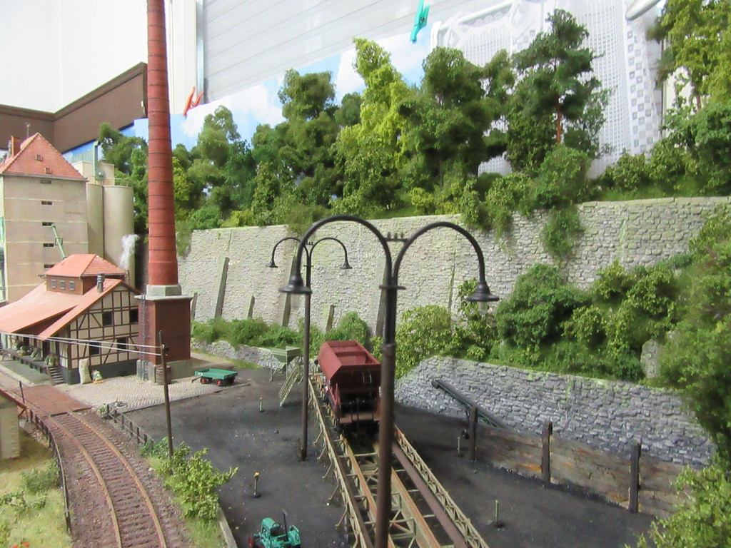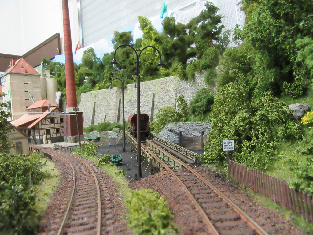@All Habe heute wieder ein wenig an meiner Bühne gewerkelt. Einer der wichtigsten Berufe an einer Bühne sind ja die Beleuchter. Ja richtig Beleuchter ,nicht Armleuchter.das ist wieder eine andere Berufsgruppe.... Also muß die Bühne beleuchtet werden Ihr erinnert Euch ja an das Originalfoto aus der Miba, welches im Anschluß nochmal kurz gezeigt wird. Ich habe einige Tage überlegt wie ich an die Lampen komme die dort abgebildet sind. Mit Hilfe der elektronischen Bucht habe ich dann einfache Bogenlampen der Fa Kahlert erwerben können. Seht hier: http://www.ebay.de/itm/Eisenbahnlampe-Bo...PRkUe059WW7622g Diese Leuchten waren ein gutes Ausgangsmaterial zur Herstellung der Lampen. Es wurde zunächst unter Mithilfe einer Unterlegscheibe die Rundung der Bogenlampe erweitert um den Look des Vorbildes zu erreichen. Anschließend wurden zwei Leuchten Rücken an Rücken in einen gemeinsamen Mast geschoben. Auch bei den Vorbildleuchten trennt sich der Mast oben in zwei Ausleger. Diesen Umstand kann ich zwar nicht ganz erreichen aber ich bin nahe dran. Also wurden zunächst zwei Capri Sonne Kirsche geleert und deren Trinkhalme(schön stabil und genau in der richtigen Größe) als Mast verpflichtet. Die kleinen Streben und Verzierungen der Ausleger wurden soweit im Foto erkennbar aus Bastelresten nachgebildet. Zunächst lackierte ich den Mast schwarz ,was jedoch überhaupt nicht wirkte auf dem Kohlenplatz. Nachdem ich eine dunkles Braun darüber gemalt hatte war ich zufrieden.Das ist eine reine Bauchentscheidung gewesen . Am Mastfuß wurden die Masten mit einem damals oft verwendeten wirksamen Anfahrschutz aus Eisenbahnschienenstücken versehen. Der Prellbock wurde gem . den Anregungen von Euch verstärkt mit zwei Stahlstreben, die die Last eines etwaigen Aufpralls nach unten ableiten können. Gem. Den Tipps von Euch wurde das falsche „10er „ Schild entfernt. Ich habe dann wie von Andreas Bauzug angeregt eine Tafel hergestellt die folgende Beschriftung erhielt: