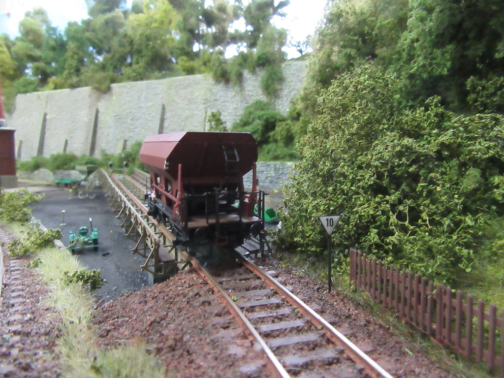 Die Umsetzung sieht sehr realistisch aus. Sogar die Sh0-Scheibe ist am Prellbock angebracht. Nun kann die Entladung der Wagen beginnen. Aber der Traktor sollte vorher seinen Standort verlassen.