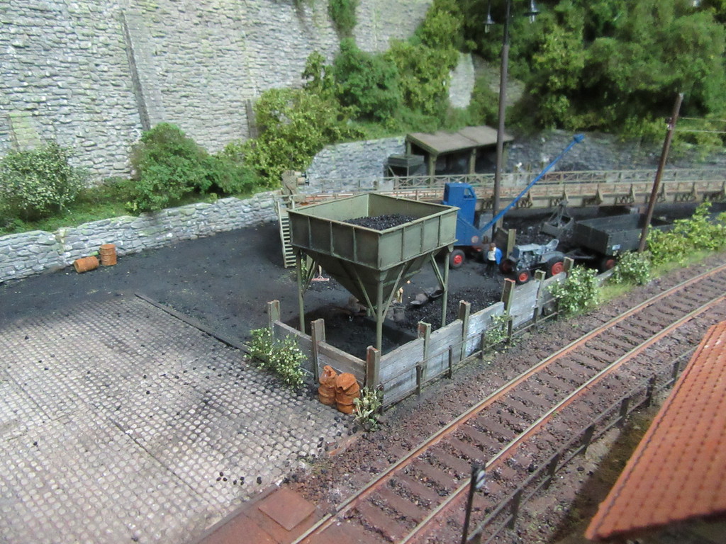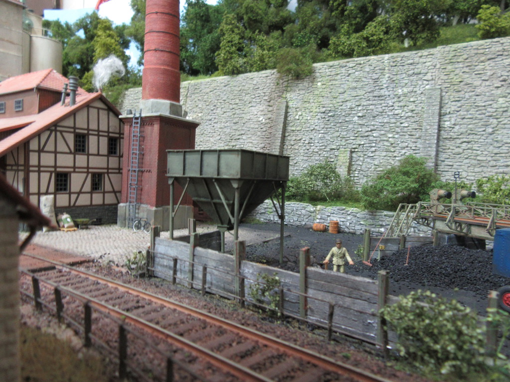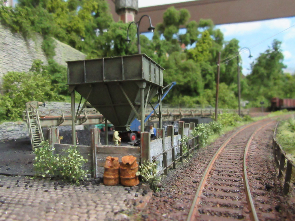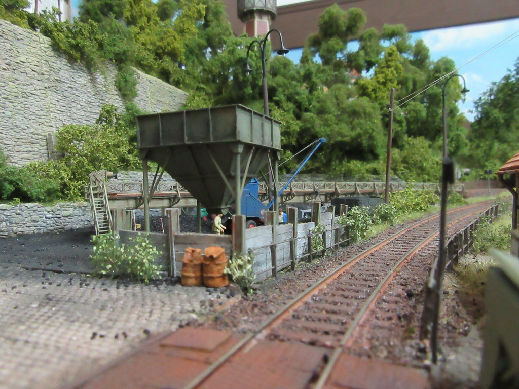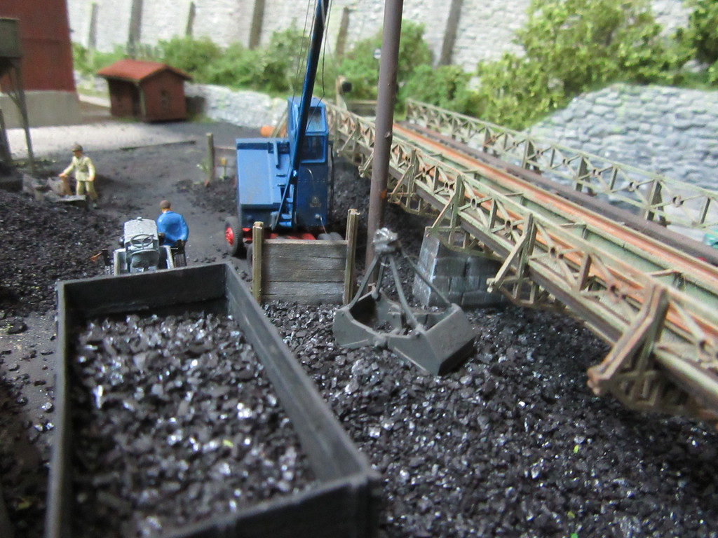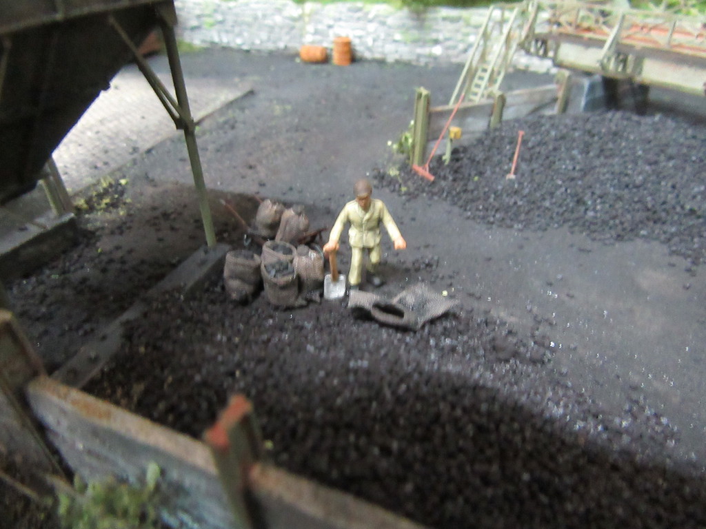 Der Kohletrichter im Vordergrund ist ja bereits bekannt. Er dient zur Verladung von Eierkohlen. Davor ist auch noch ein Mitarbeiter dabei Säcke mit Eierkohle zu füllen. Einige sind schon voll. Ein paar leere Säcke warten noch auf die Schüppe.