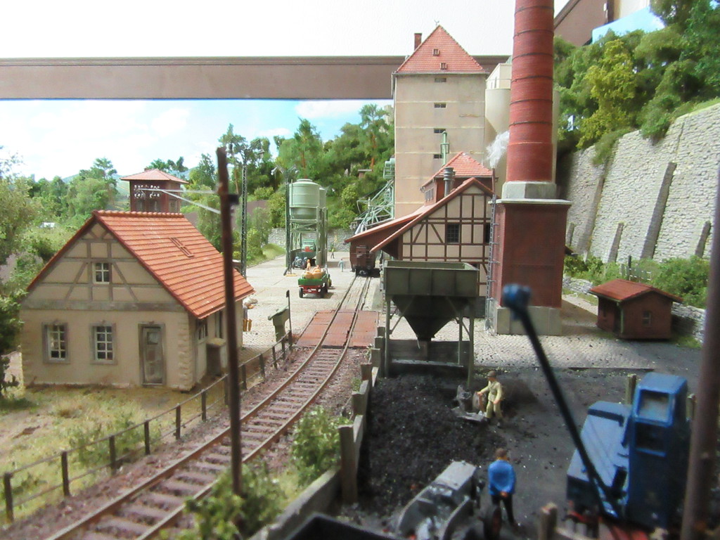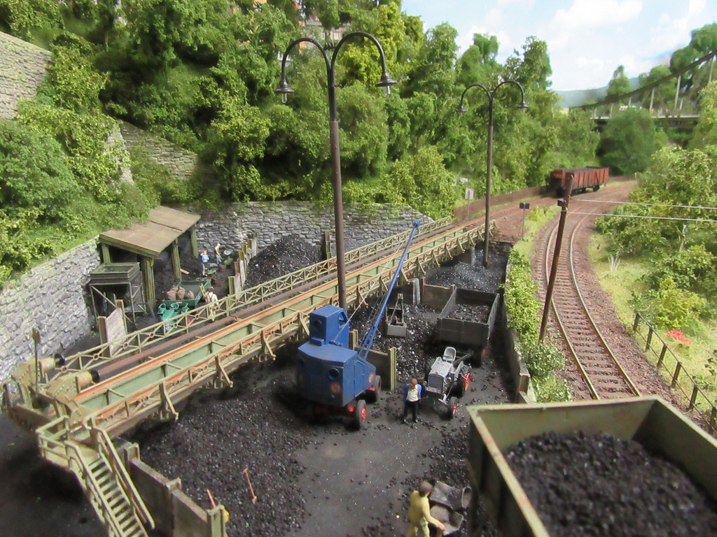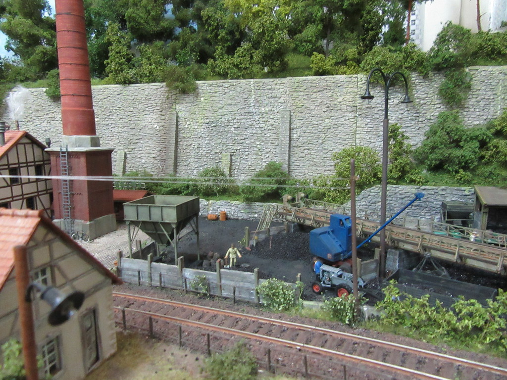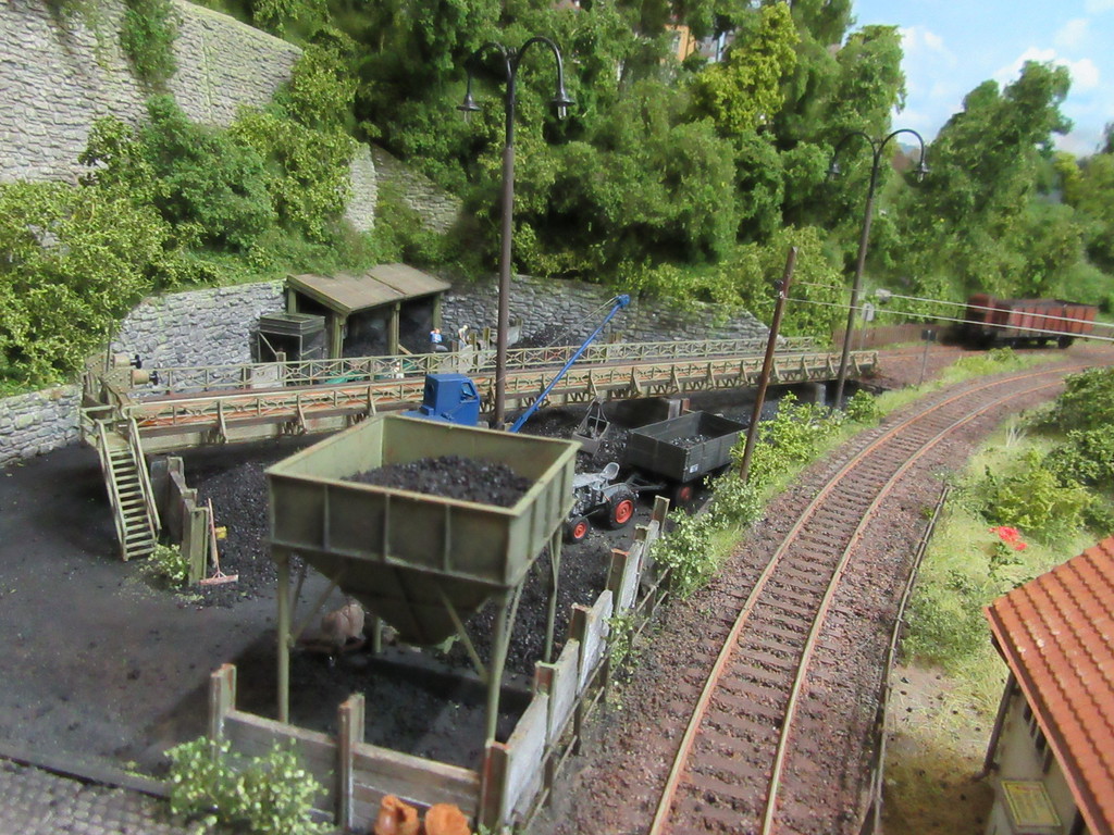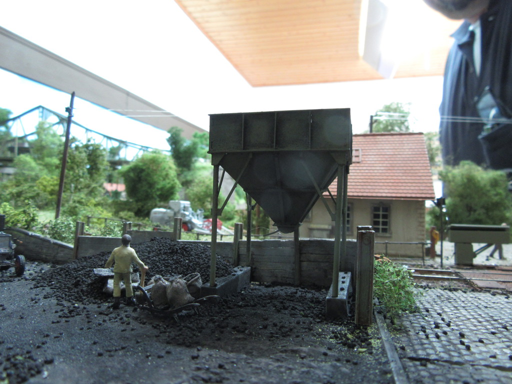 Der Kohletrichter im Vordergrund ist ja bereits bekannt. Er dient zur Verladung von Eierkohlen. Davor ist auch noch ein Mitarbeiter dabei Säcke mit Eierkohle zu füllen. Einige sind schon voll. Ein paar leere Säcke warten noch auf die Schüppe.