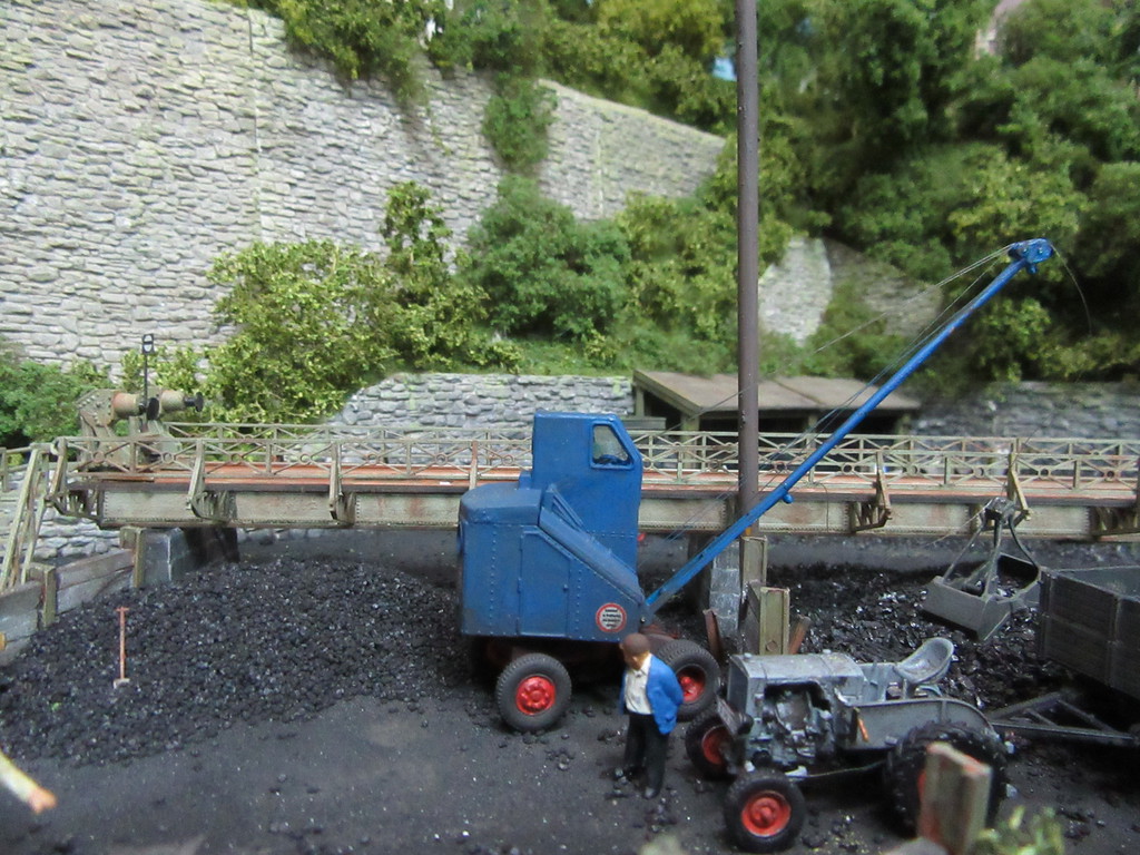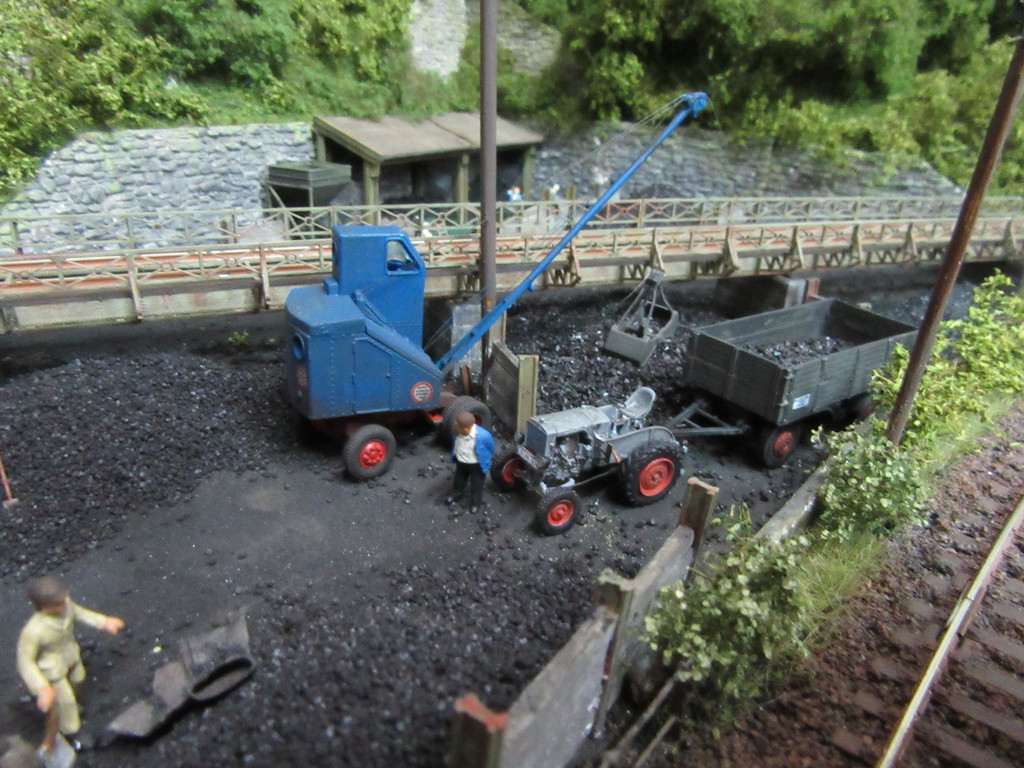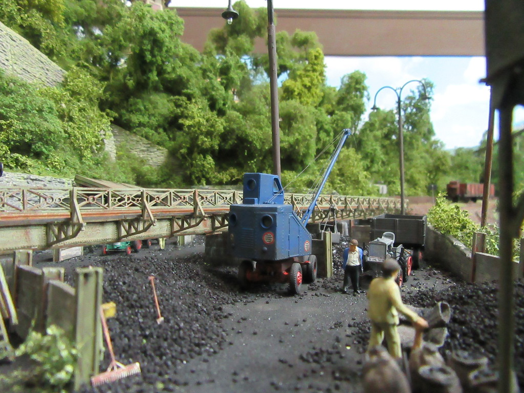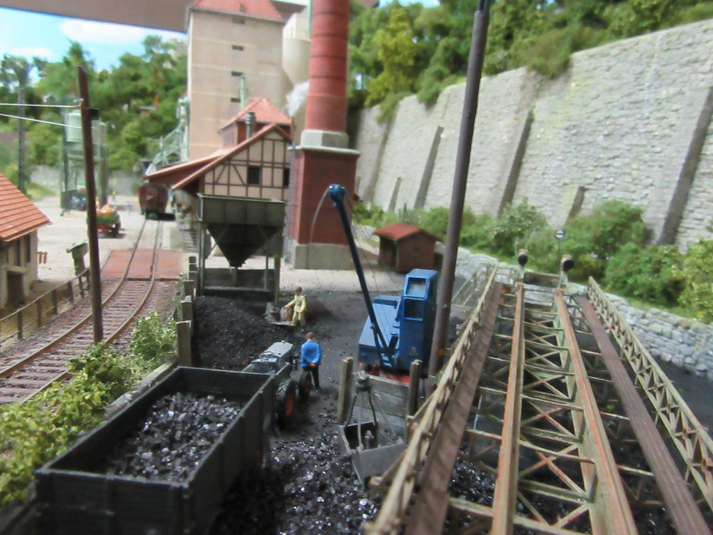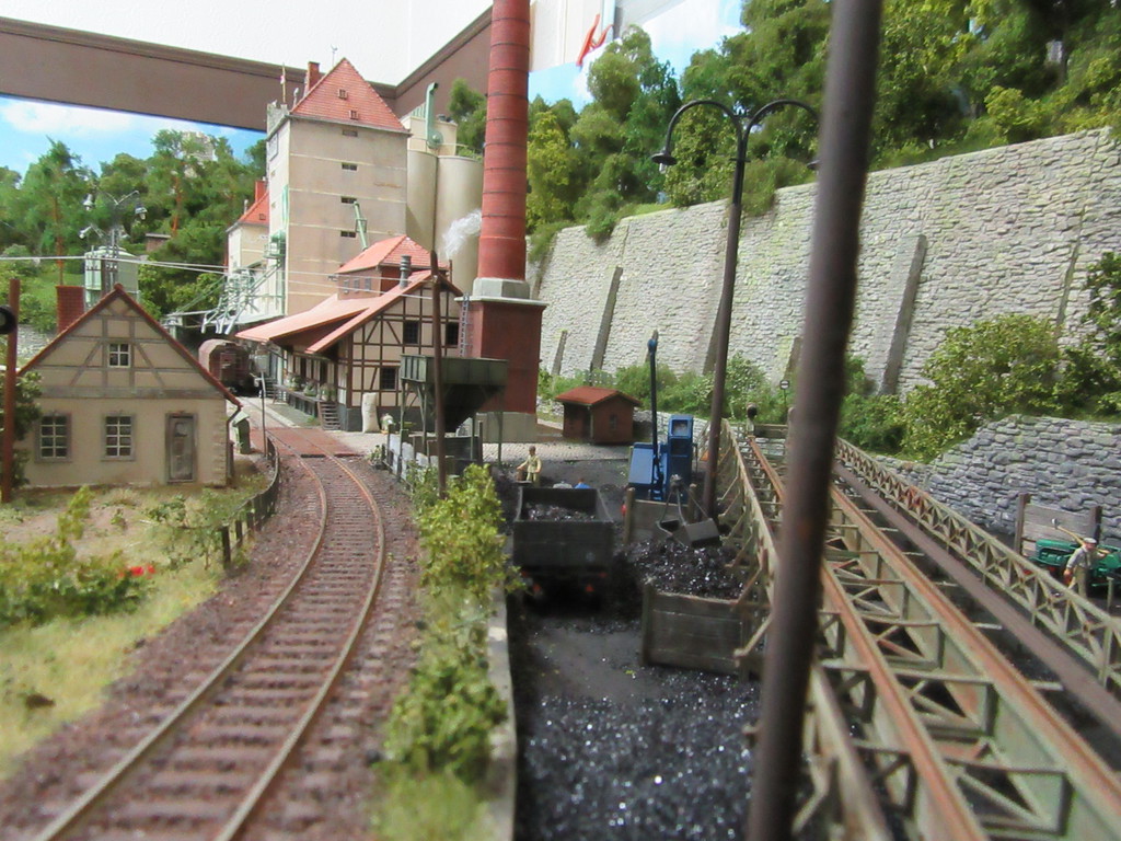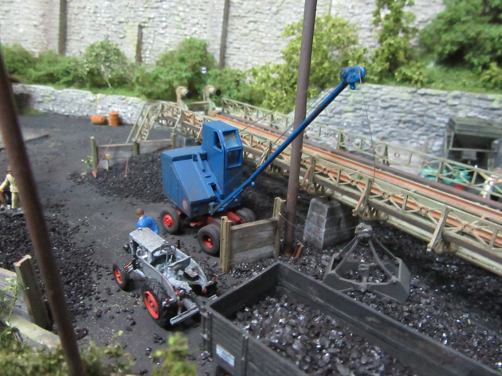 Der Kohletrichter im Vordergrund ist ja bereits bekannt. Er dient zur Verladung von Eierkohlen. Davor ist auch noch ein Mitarbeiter dabei Säcke mit Eierkohle zu füllen. Einige sind schon voll. Ein paar leere Säcke warten noch auf die Schüppe.