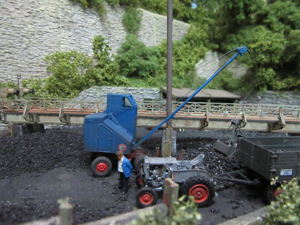 Wir sehen Kohlenheini hier beim Warten während des Ladespiels durch den Fuchs. Brimmel hat seinen Güldner mit Anhänger rückwärts in die Kohlenecke rangiert und der Fuchs ist soeben dabei,Kohlen für die Heizung einer örtlichen Großgärtnerei zu verladen.