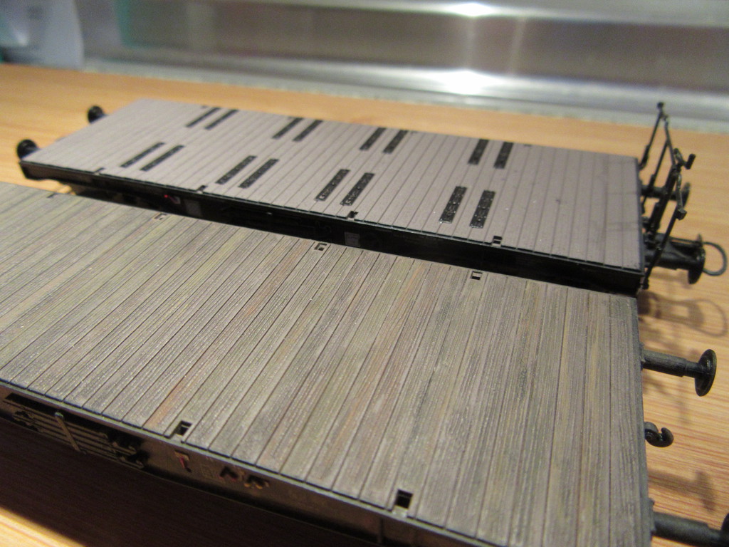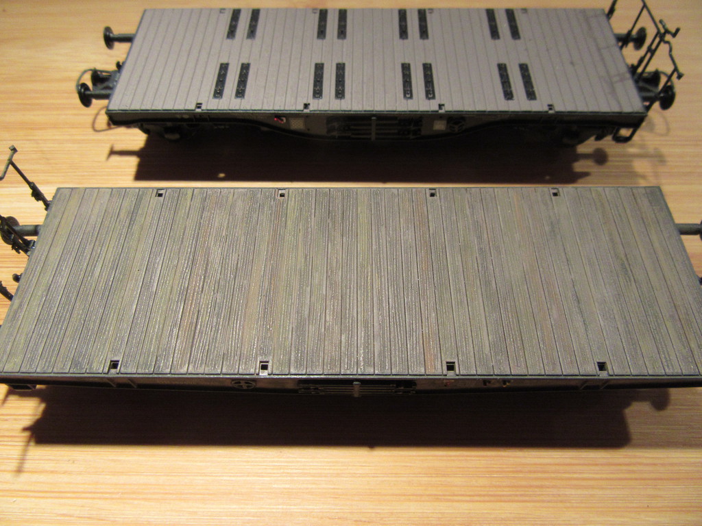 Der Boden wurde zunächst schwarz lasiert und dann mit verschiedenen braun und ocker Tönen vorsichtig farblich behandelt,d.h. einzelne Bretter wurde wiederholt bemalt um einen Holbodencharakter etwas zu betonen und das sehr einheitliche grau des neuen Wagens zu verändern.Vergleiche den grauen Boden des zweiten Wagens der noch unbehandelt ist und sehr uniform aussieht. Man kann natürlich noch mehr machen.....
