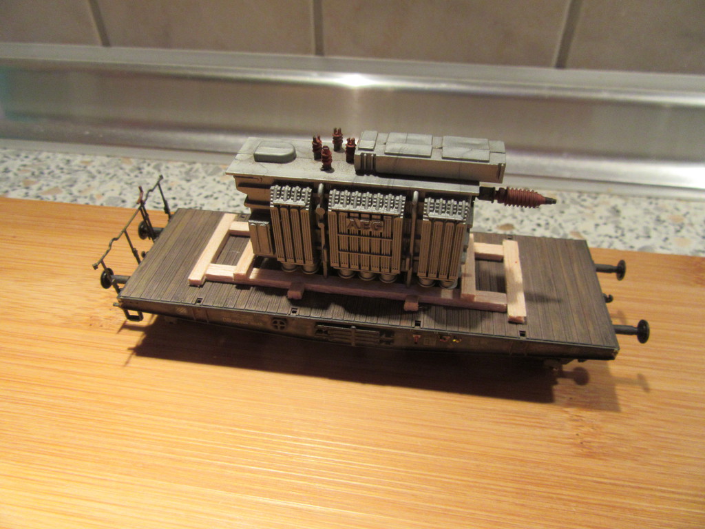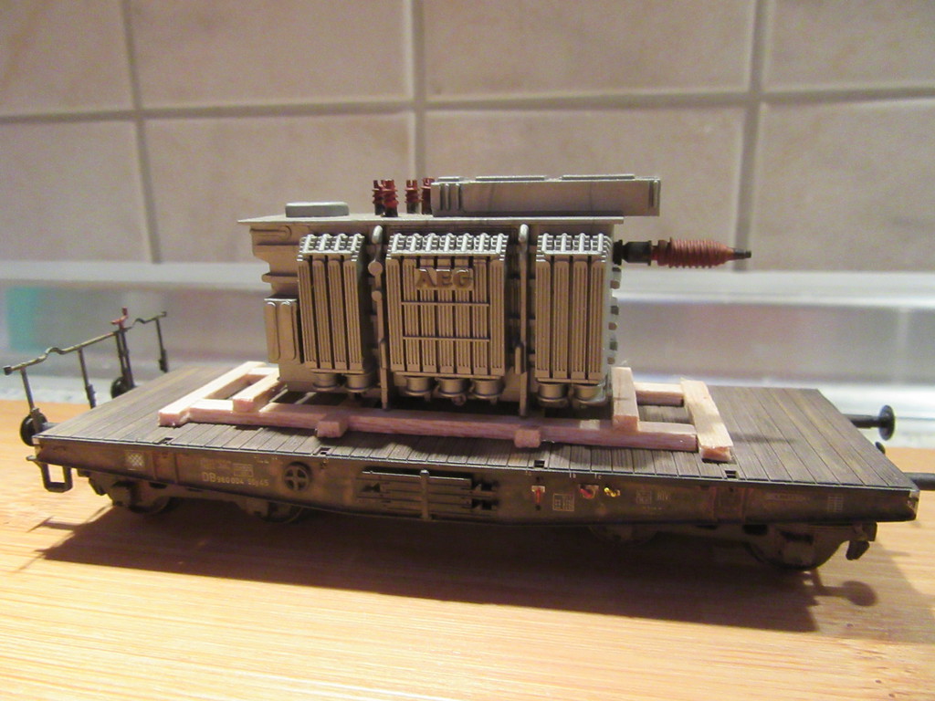 Ich bin ja glühender Verehrer der Güterwagenbücher von Stefan Carstens und schmökere immer wieder darin. Es gibt hervorragende Beispiele für Beladungen darin. So machte ich mir vor kurzem die Arbeit einen schweren Flachwagen,(Artitec) mit einem Trafo zu beladen ,der mir auf einer Börse in die Hände gefallen war. Exaktes Beispiel dafür in den Carstens Büchern über die Flachwagen. Dort gibt es ein Foto das mir als Vorlage dient.