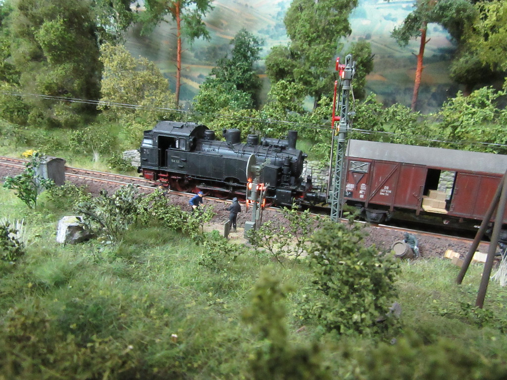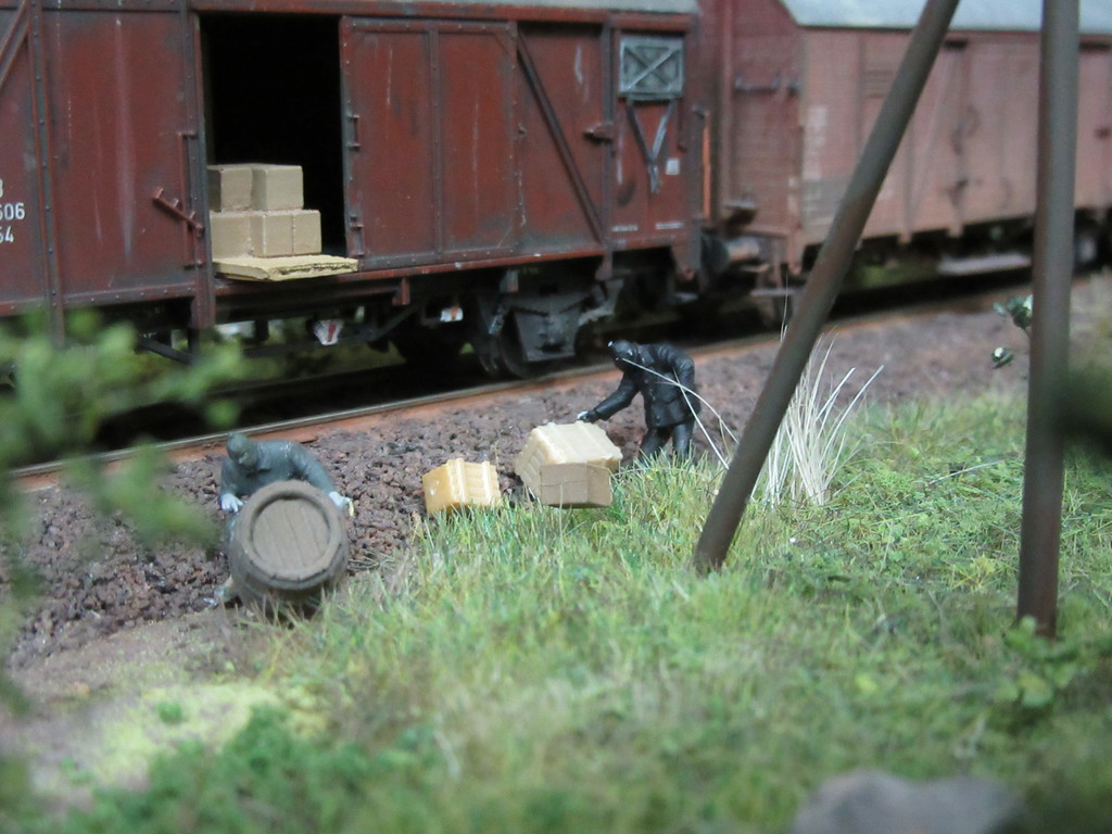 Die drei Männer in schwarz haben tatsächlich den morgendlichen NG gestoppt. Während einer die Lokmannschaft in Schach hielt haben seine zwei Kumpanen einen G Wagen aufgebrochen und suchten etwas… Als sie schließlich nicht fündig wurden ,lassen die drei „M´s“ ein paar Packstücke mitgehen und befehlen der verdutzten Lokmannschaft weiterzufahren.