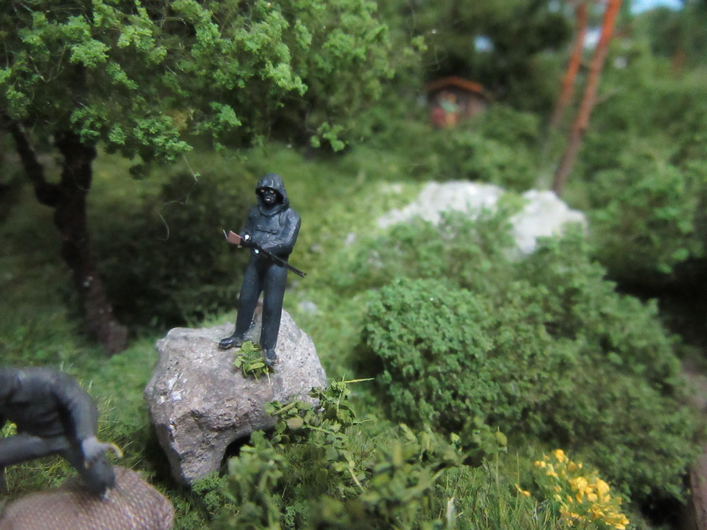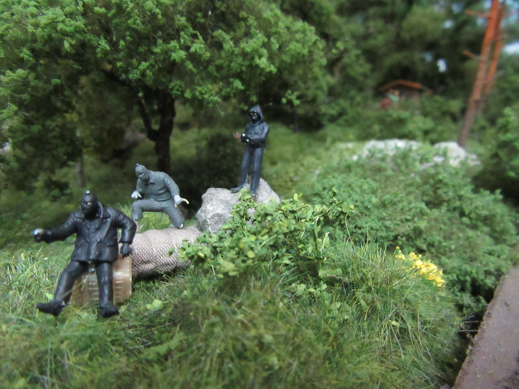 Kaum hatte der kurze Marzipanzug Küppersbusch verlassen ,erfuhr man in der Neustädter Polizeiwache das die drei „M´s“ in der Nähe gesichtet wurden. „Ausgerechnet die drei M´s“ :wiederholte Oberwachtmeister Reh fast schon ehrwürdig ,nachdem er den Bericht eines Kollegen von Nachbarort studiert hatte.“So ein Mist“, raunte er „und das gerade jetzt!“ Gerade jetzt!.......was will Reh uns damit sagen? Doch bevor wir ihn Fragen können ist er bereits dabei die Bilder anzuschauen die dem Bericht des Kollegen beiliegen. Einem Passanten war es gelungen mit seiner Kamera in einem Wald an der Strecke nach Neustadt,heimlich Fotos von den drei „M´s“ zu machen. Während eines Spazierganges durch den morgendlichen Wald hatte er sich gewundert das der sonst vorbeiratternde Güterzug plötzlich stehen geblieben war. Er schlich sich heran und es gelangen ihm folgende Bilder,die er aus einiger Entfernung mit seiner Kamera schoß……..