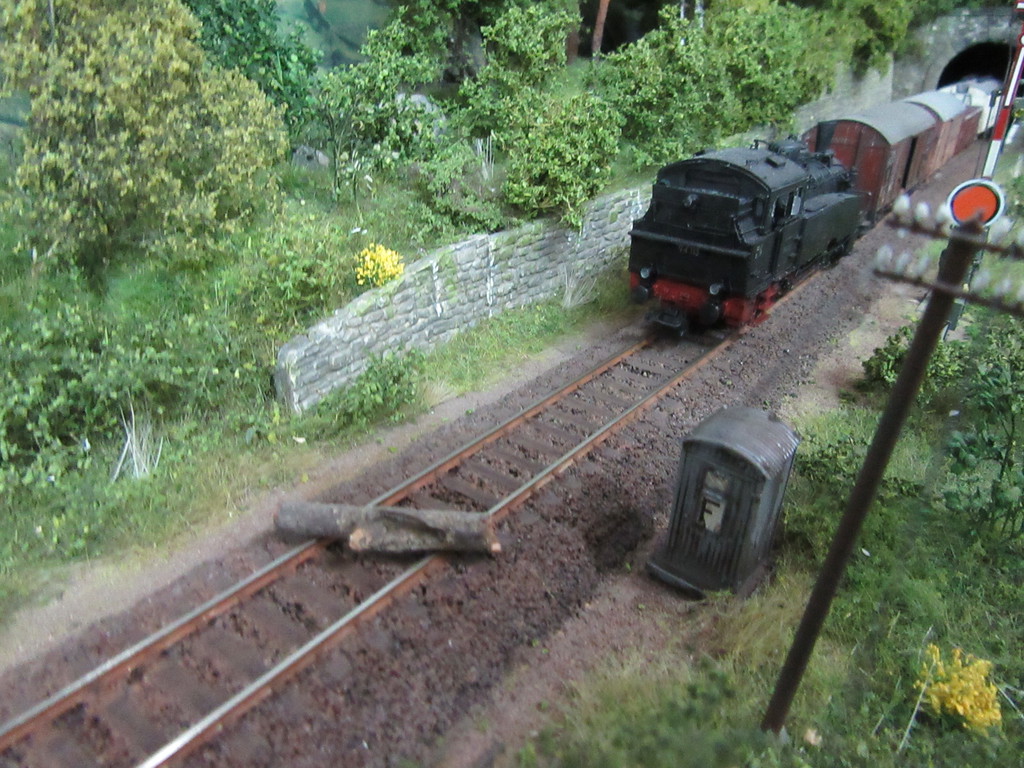 Tatsache,man hat dem Zug einen halben Baum in den Weg gelegt. Nur gut das Lokführer Siegfried Schleicher eher einer von der langsamen Truppe ist und den Zug noch rechtzeitig zum Stehen brachte.
