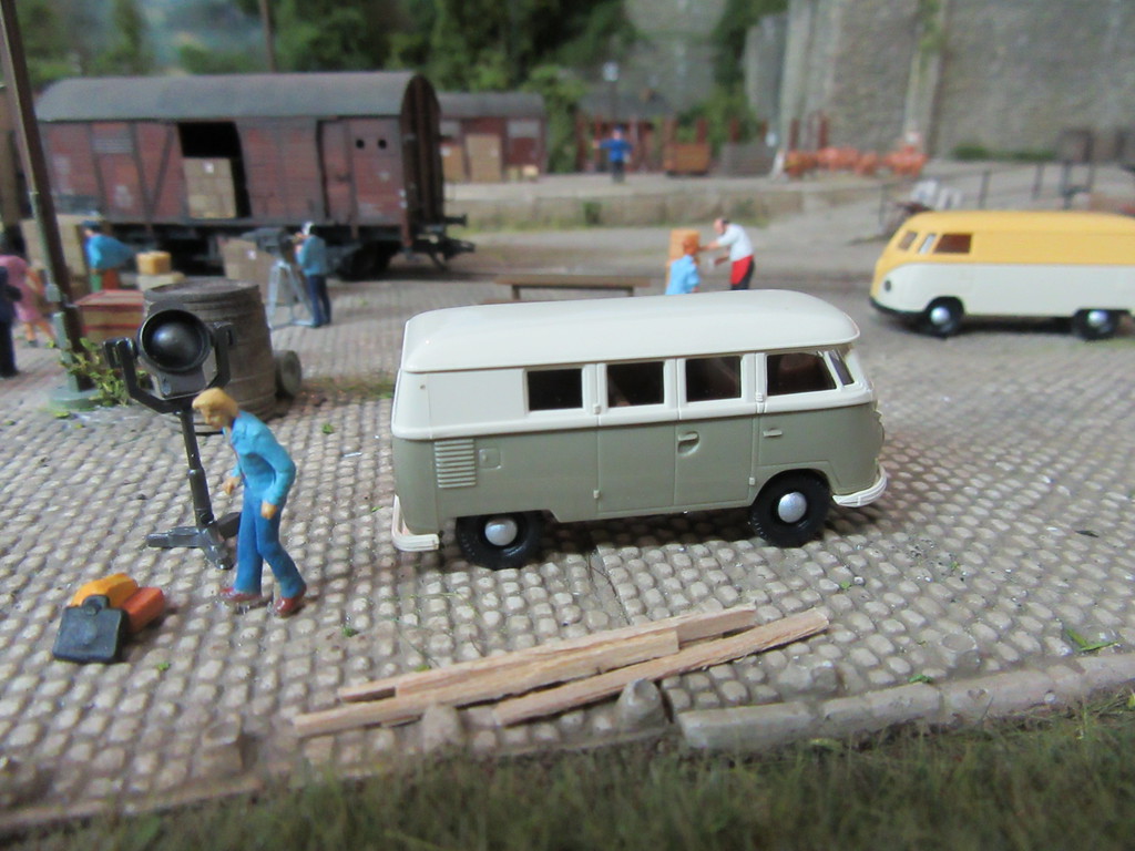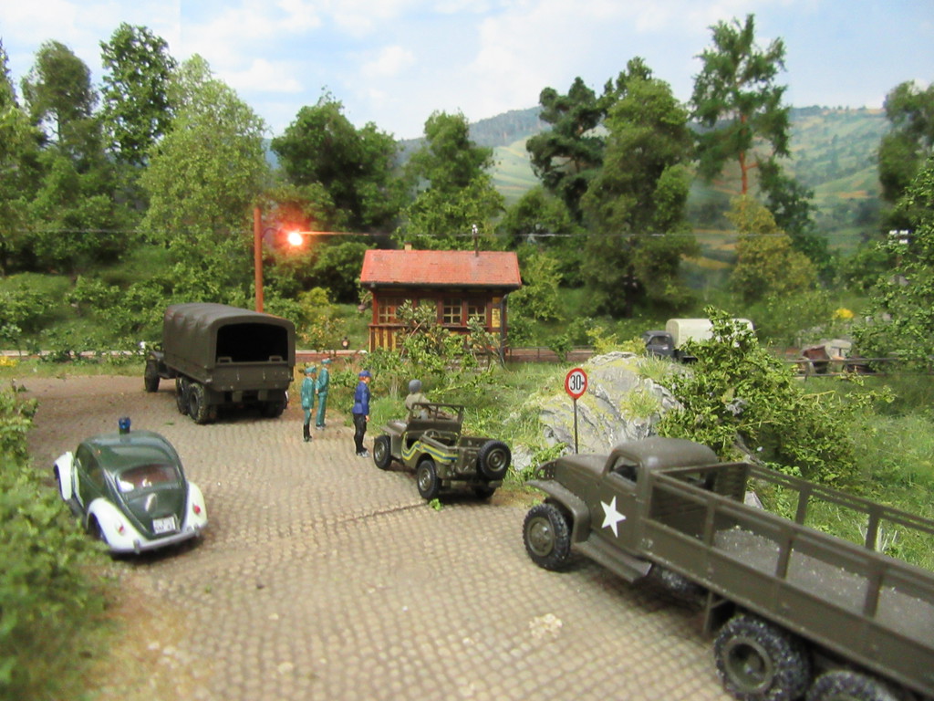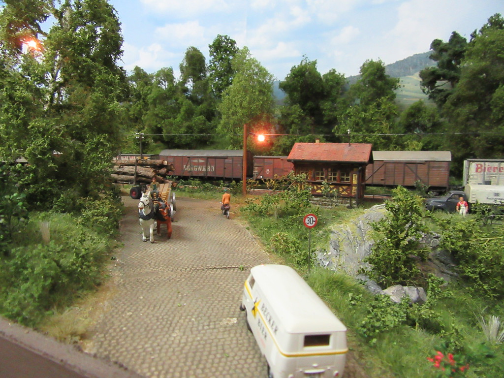 Heute aber sieht die Sache anders aus. Das Fuhrwerk mit der Bretterladung ist verschwunden und auch der VW T1 mt dem guten Becker Bier ist weg. Man sieht auch kaum Passanten,irgendeine Spannung liegt in der Luft. Der Anblick der Sägewerksstraße ist auch stark verändert heute. Eine Reihe von Fahrzeugen steht hier heute,die man sonst eher nicht sieht.