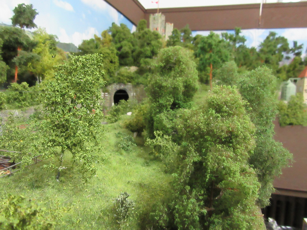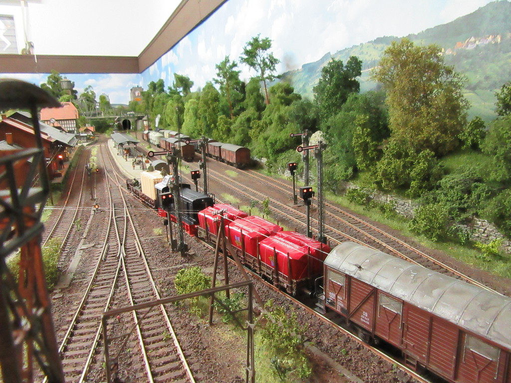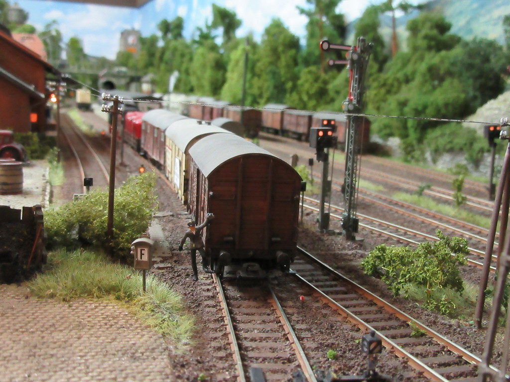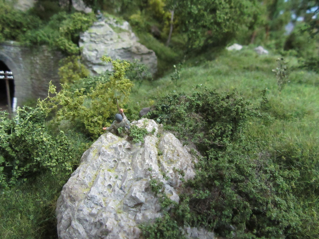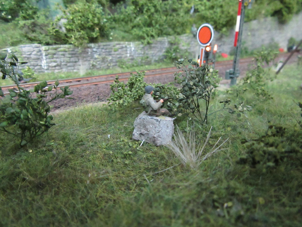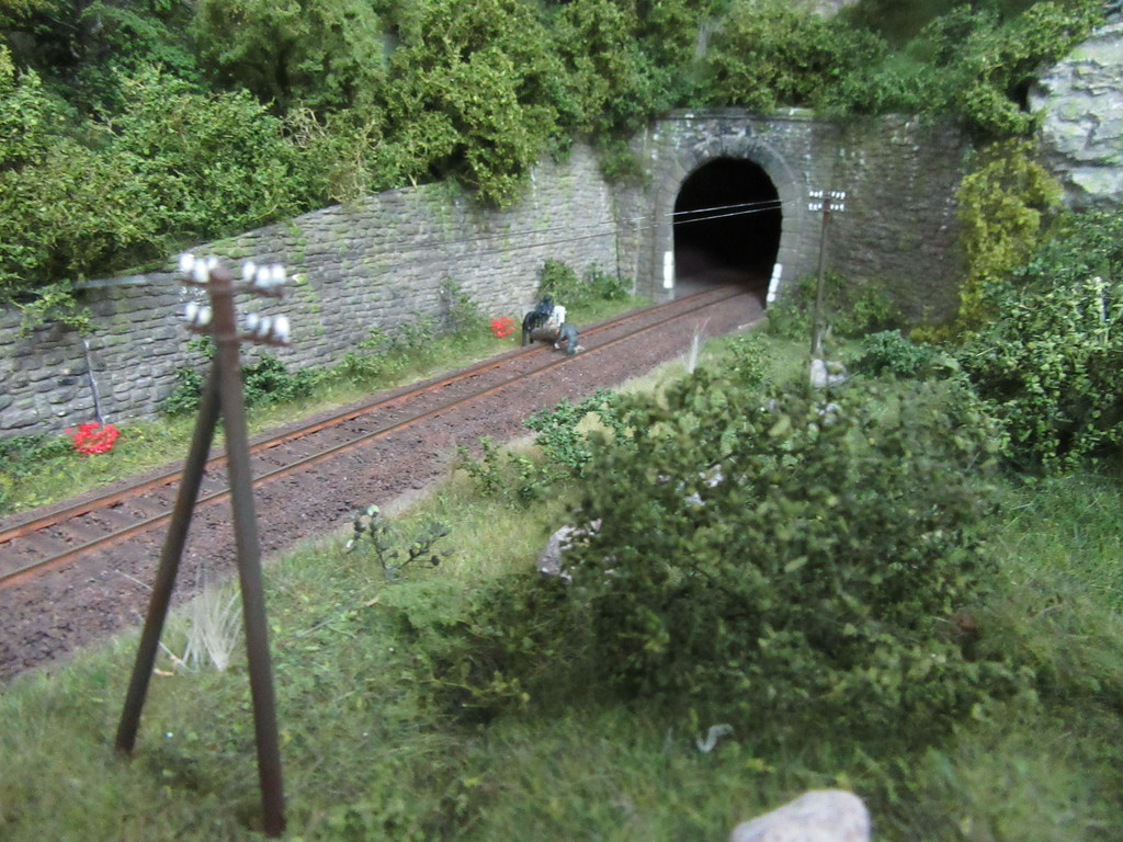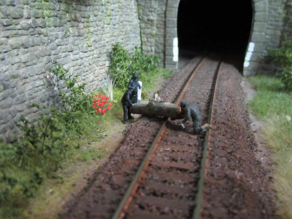 Schauen wir also zum Tunnel. Tatsache ….die drei M´s sind in der Nähe des Portals dabei wieder ihren „Entgleisungsbaum“ auf die Schienen zu hieven.