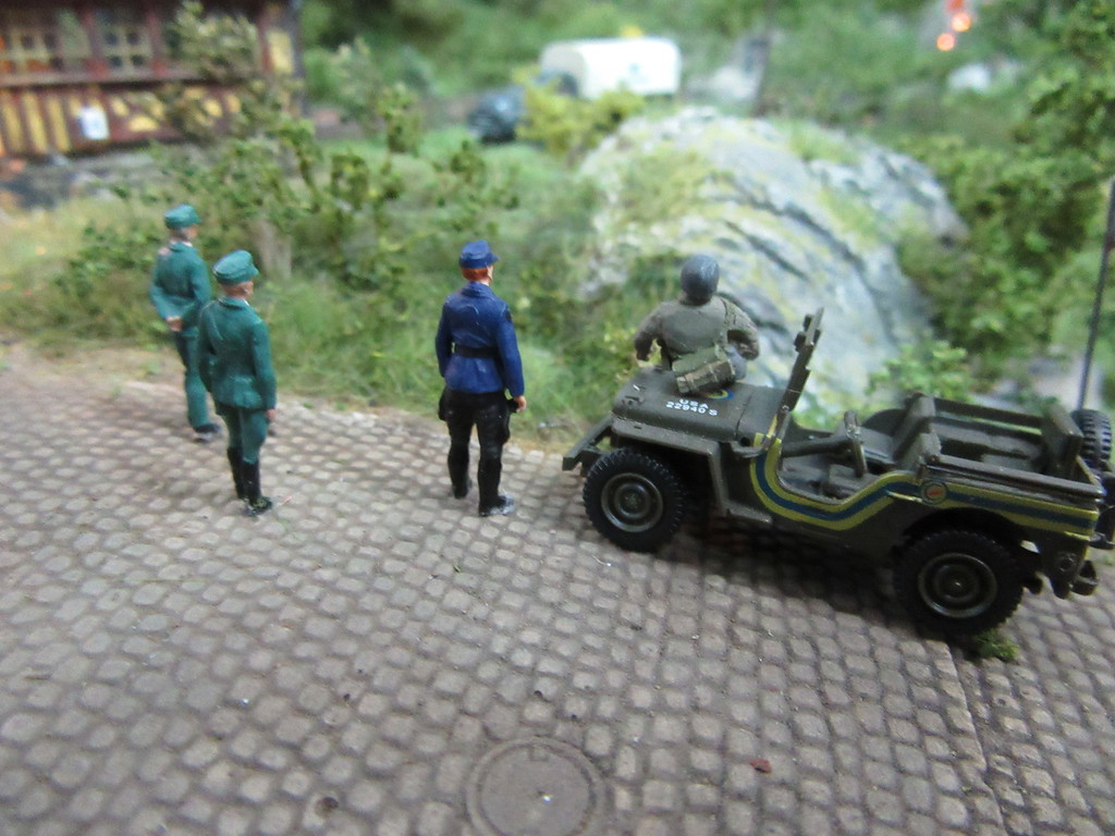 Alle Beteiligten scheinen froh zu sein das die Gruppe GI Military policemen dem örtlichen Polizeiaufgebot zur Hilfe eilen.