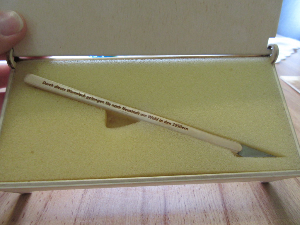 In der Bastelkiste liegt ein handgemachtes Skalpell ,gefertigt aus Umrührhölzchen für Kaffee to go. Das Skalpell wiederrum wurde mit dem bekannten Neustädter Wahlspruch „Durch dieses Wurmloch gelangen Sie nach Neustadt am Wald in den 1950ern“, und auf der Rückseite mit dem Forumskürzel graviert.