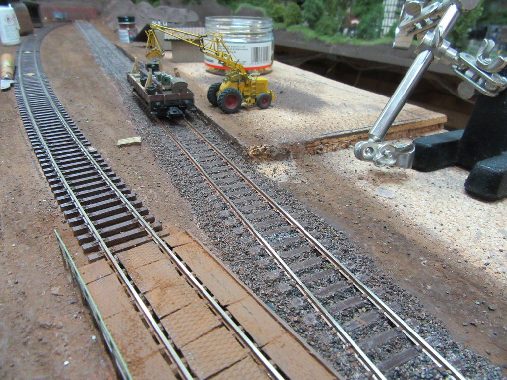 Ein Gleis und die Einfahrweiche wurden geschottert,mehrfach nachgeschottert um Löcher möglichst zu verschließen. Dann wurde das Schotterbett und die Schienen ein wenig mit Farbe bearbeitet.