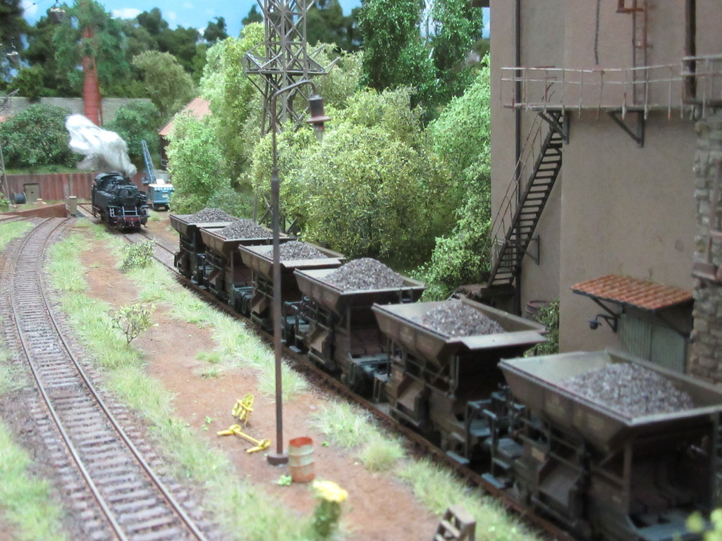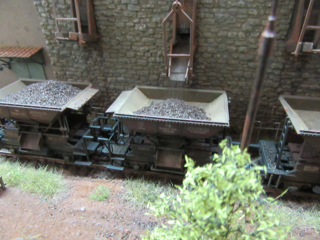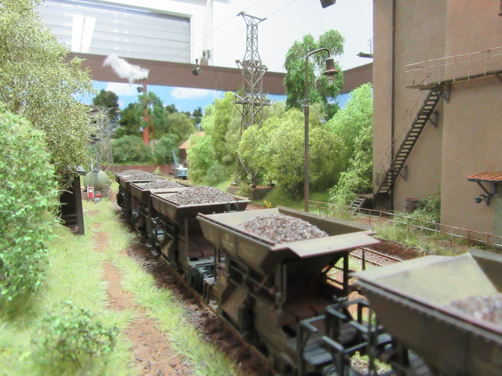 Noch eine kleine Idee beim Betrachten. Würden nicht auf und neben dem Gleis an dem Gegäude mehr Schottersteine herumliegen von den Beladungsvorgängen? Teils die Schwellen etwas verstecken? Ob nun im Viereck durch versehentliche Überladungen von Güterwagen aufgrund eines abgelenkten Mitarbeiters oder eines schwergängigen Trichters?