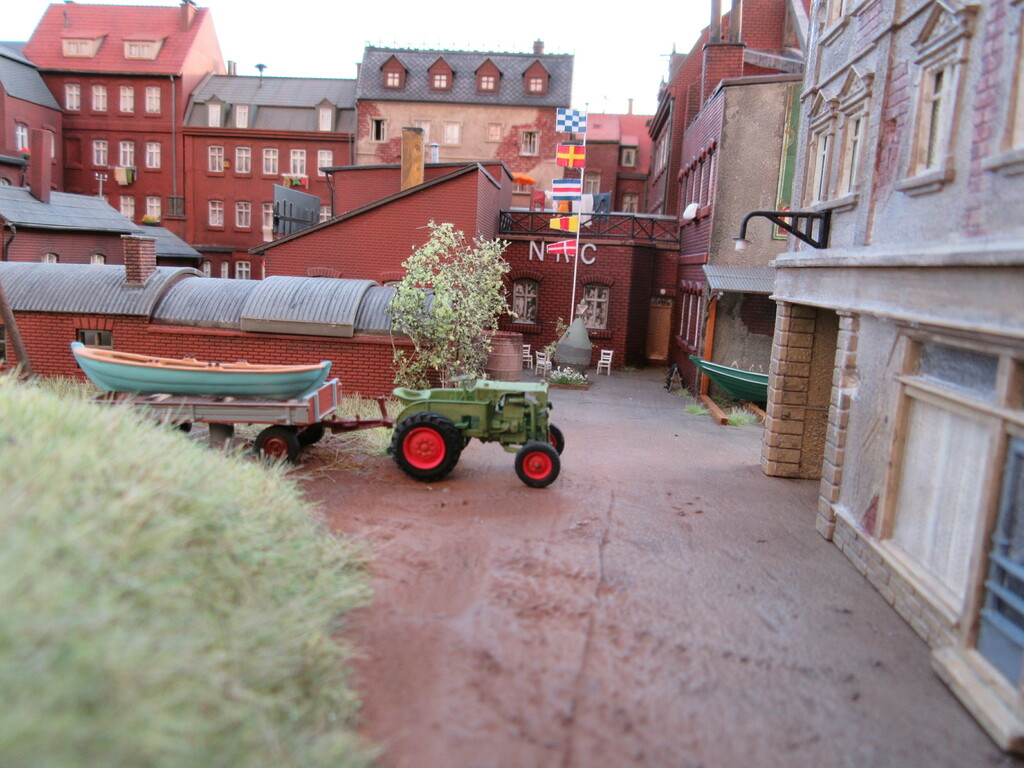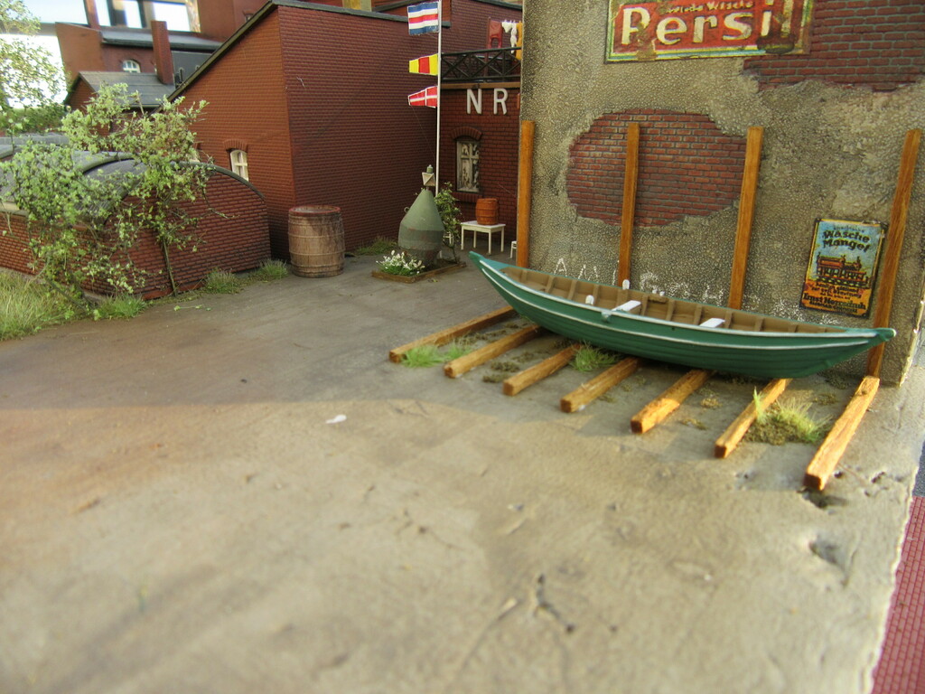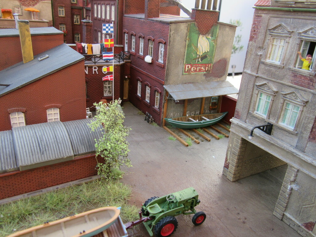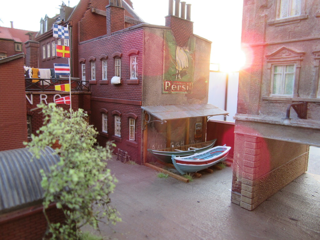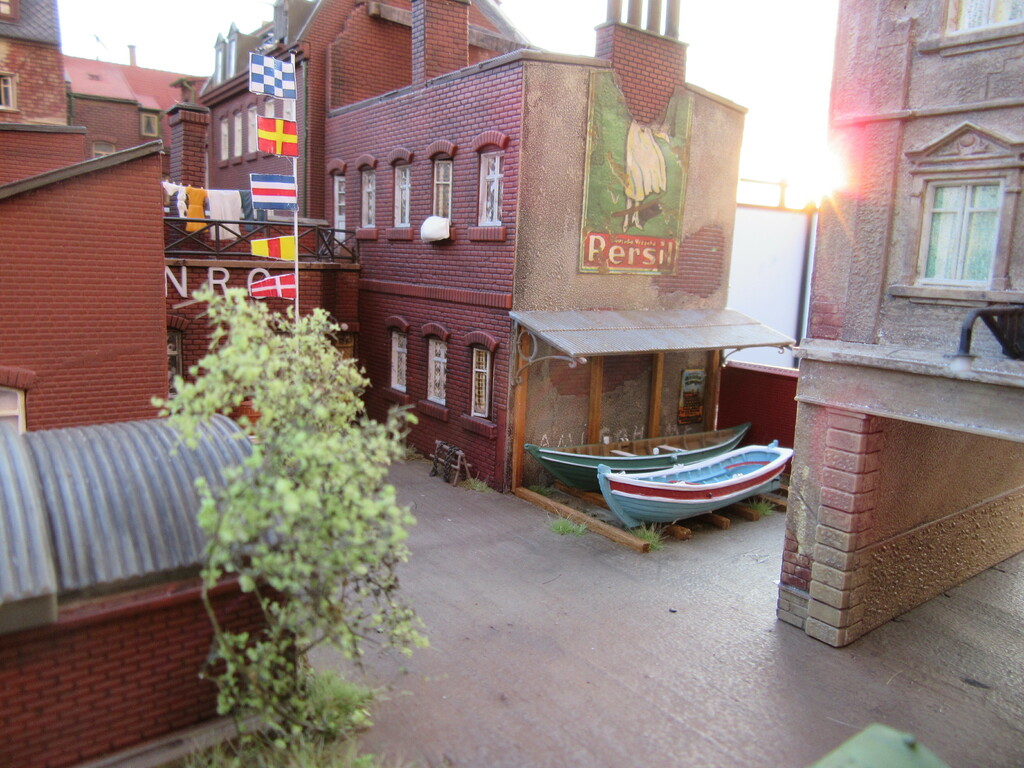 Moin Willi, wieder schöne Fotos, danke fürs Zeigen! Die Boote sehen ja nicht soo riesig aus (mit geklebten Planken - nach den ersten Fotos zu schließen - ?) Somit würde ich für einen Kran in diesem engen Arreal keinen Bedarf sehen. Das Abladen schafft man schier mit Manneskraft oder einem Gabelstapler, wie schon erwähnt. Diese Hinterhofszenen sind wunderschön eingefangen, die sind perfekt gelungen! Chapeau! Die Aufsicht (auch kopfüber) scheint bei solchen Ergebnissen eher inspirierend als hinderlich hemmend zu wirken. Also nur weiter so, daß Dich von der stressigen Berufsarbeit nicht abhalten! Wozu gibt es MoBa und Boote! Alles Gute für Dich und die Kontrolleure, genießt auch das Leben! Habe ich Dich doch auch sehr als Genußmensch in Erinnerung.... Bis bald wieder! Alexander