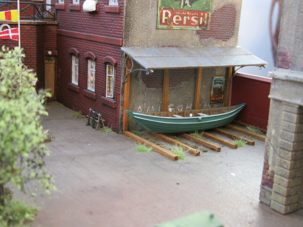 Was denkt Ihr? Wäre es glaubhaft in der Lücke der Häuserreihe, siehe Bild hier zwischen den beiden Häusern, einen kleinen Kran oder einen Flaschenzug einzubauen, damit unsere Freunde die großen Ruderboote verladen bekommen? So was hier z.B.