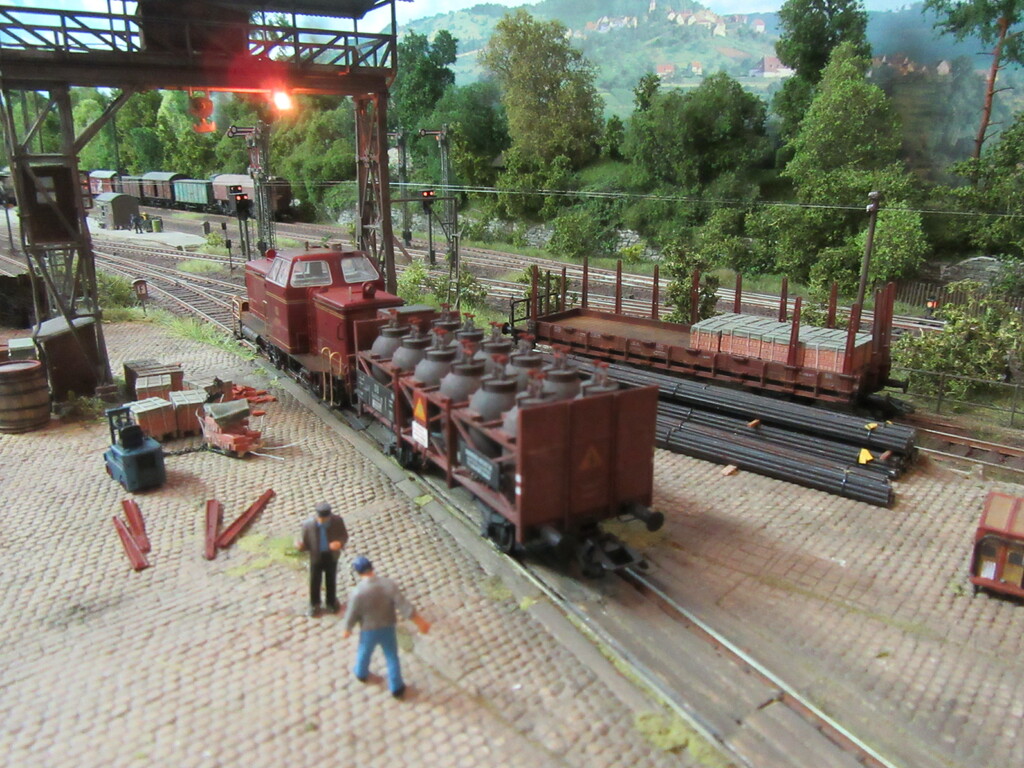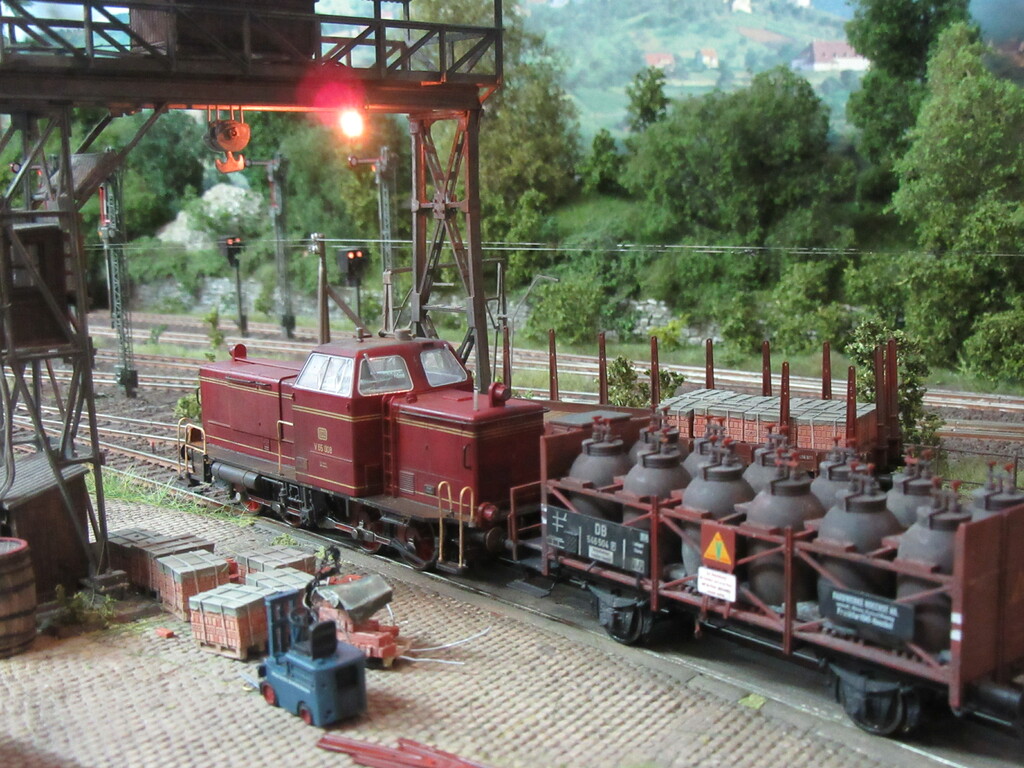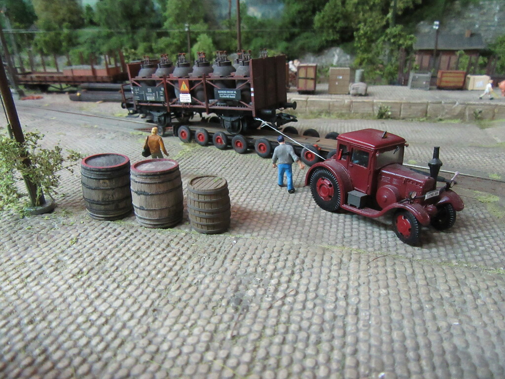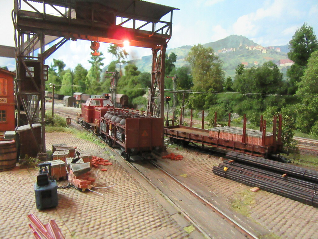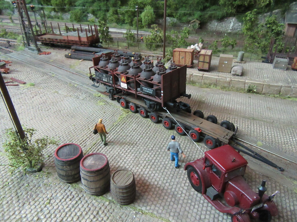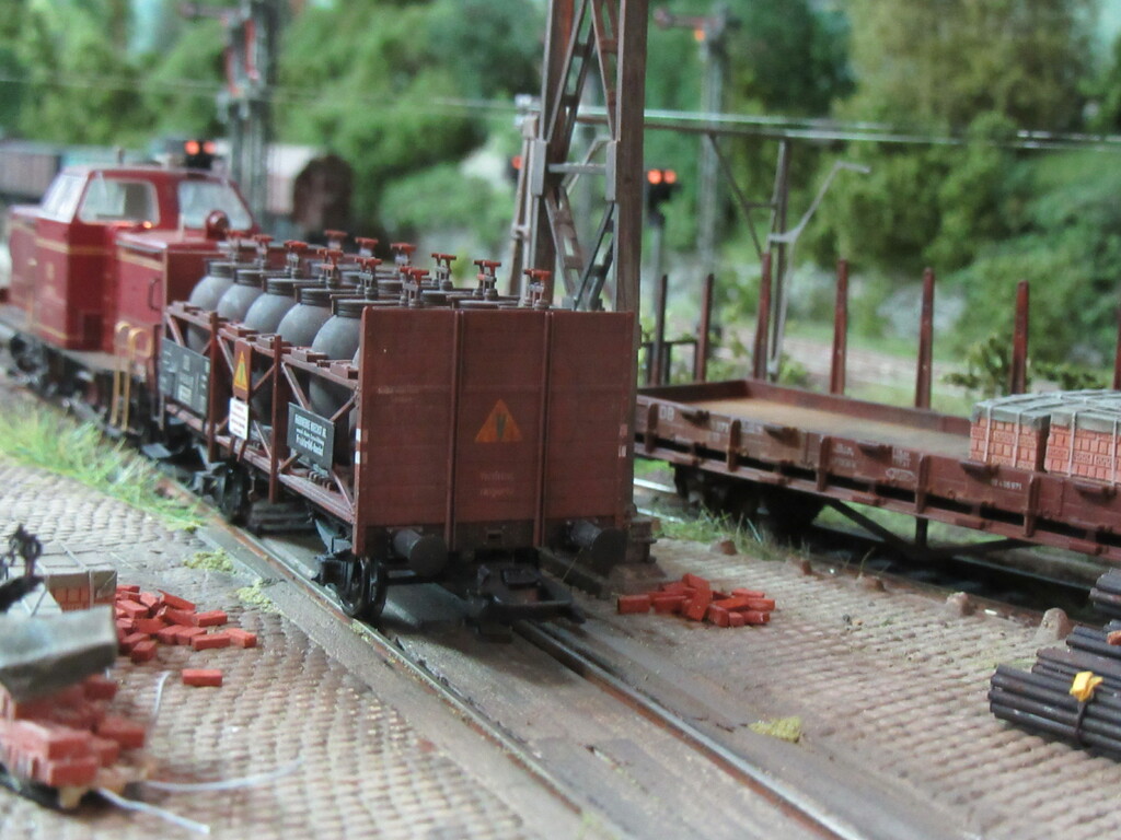 Nachdem die Ziegel endlich aus dem Gleis geschafft wurden holt Zirkelborn seine Lok mit dem angehängten Topfwagen und setzt den R Wagen ins Nachbargleis um. Nun kann der Säuretopfwagen für die Farbenfabrik Becolin zugestellt werden.