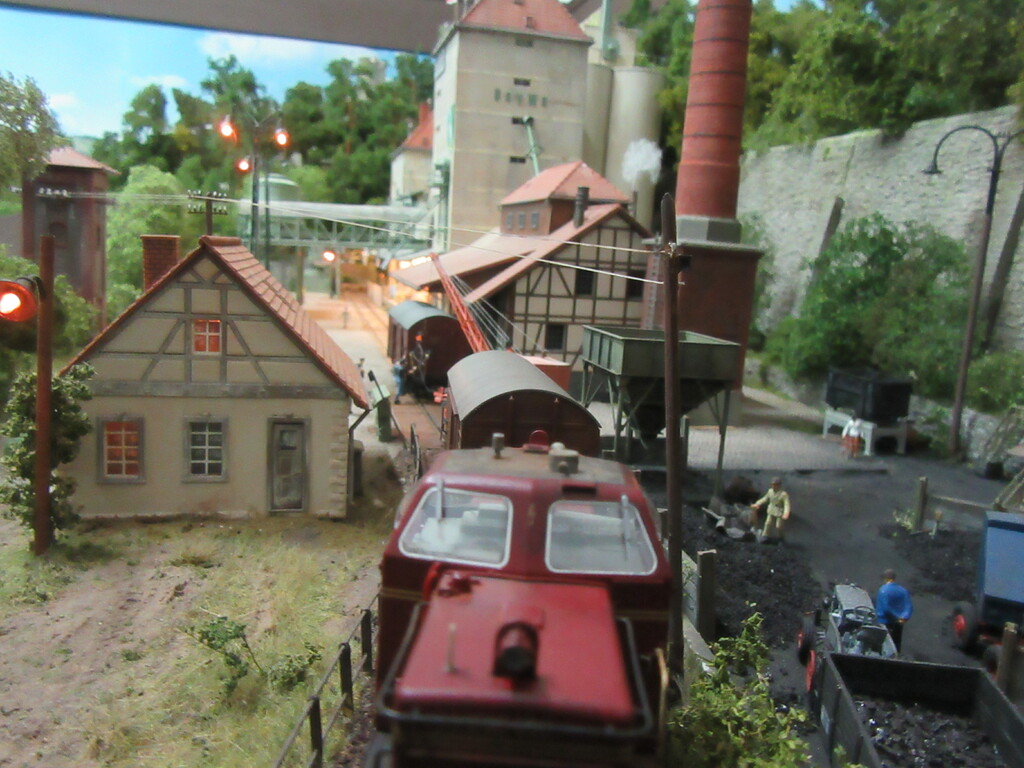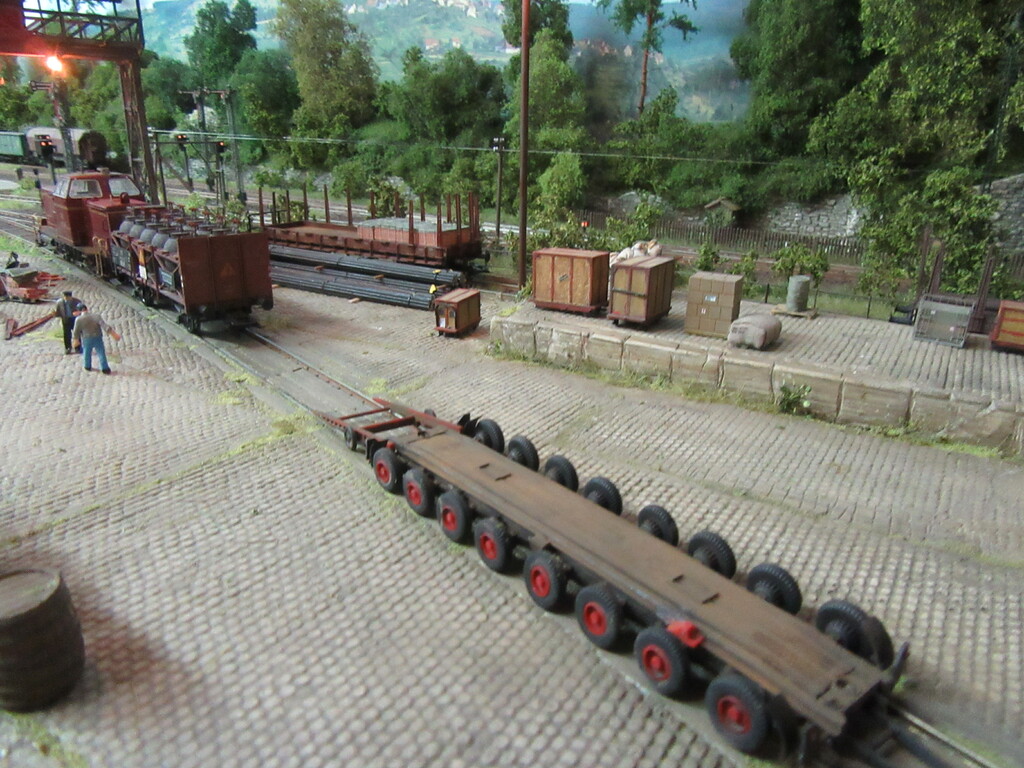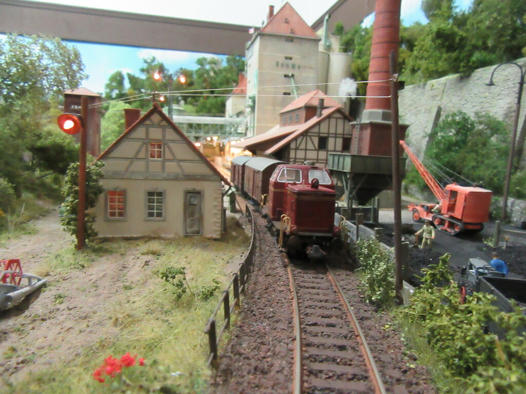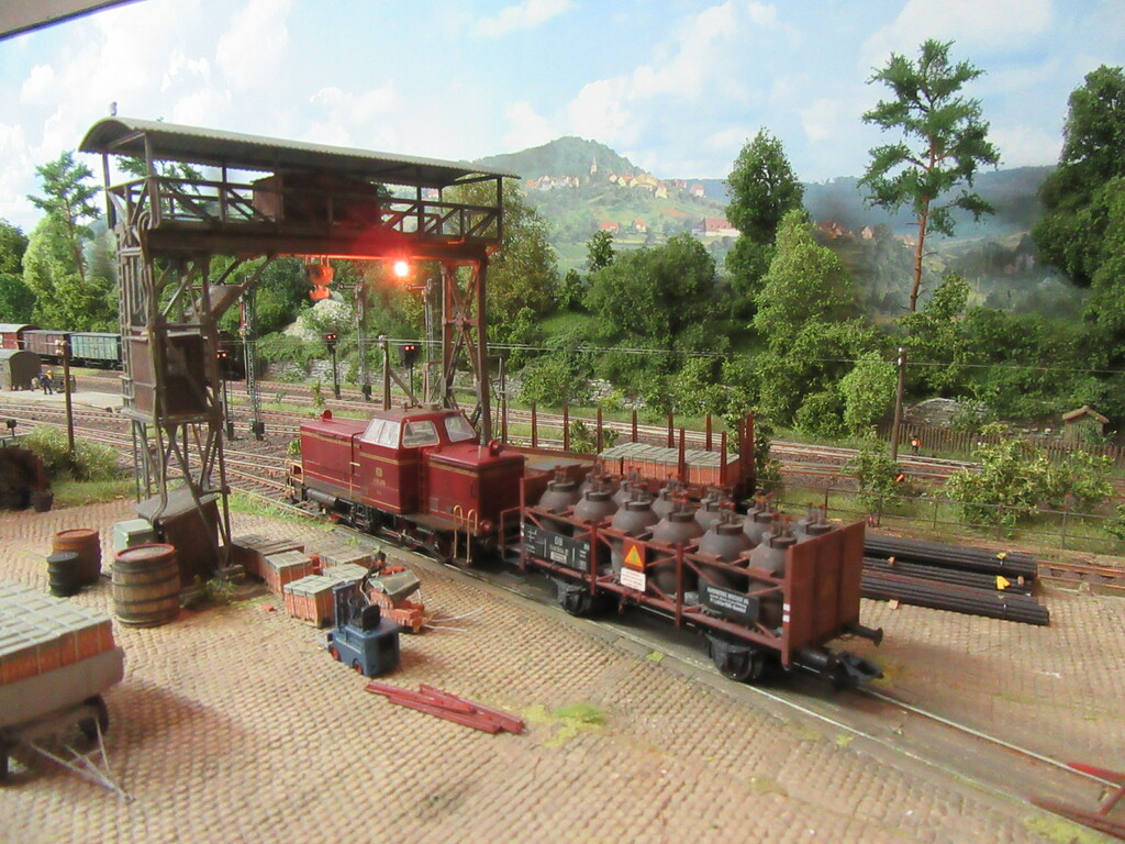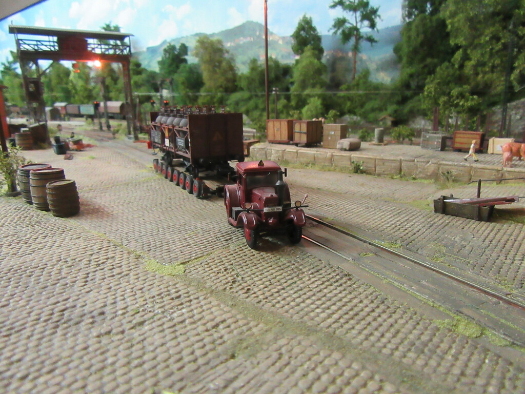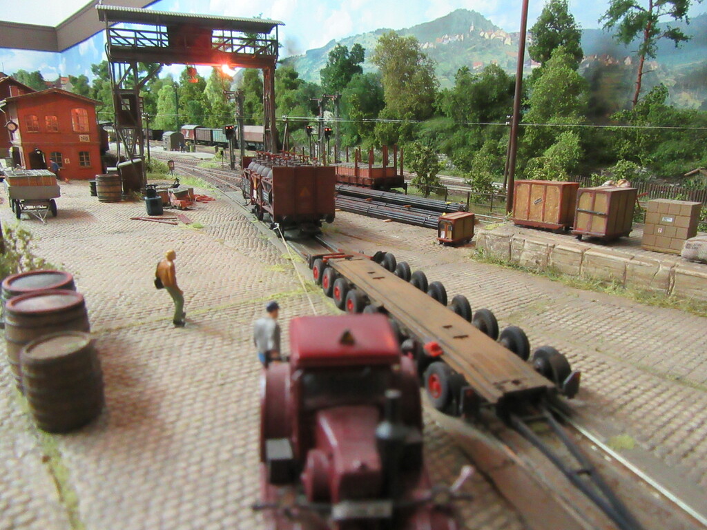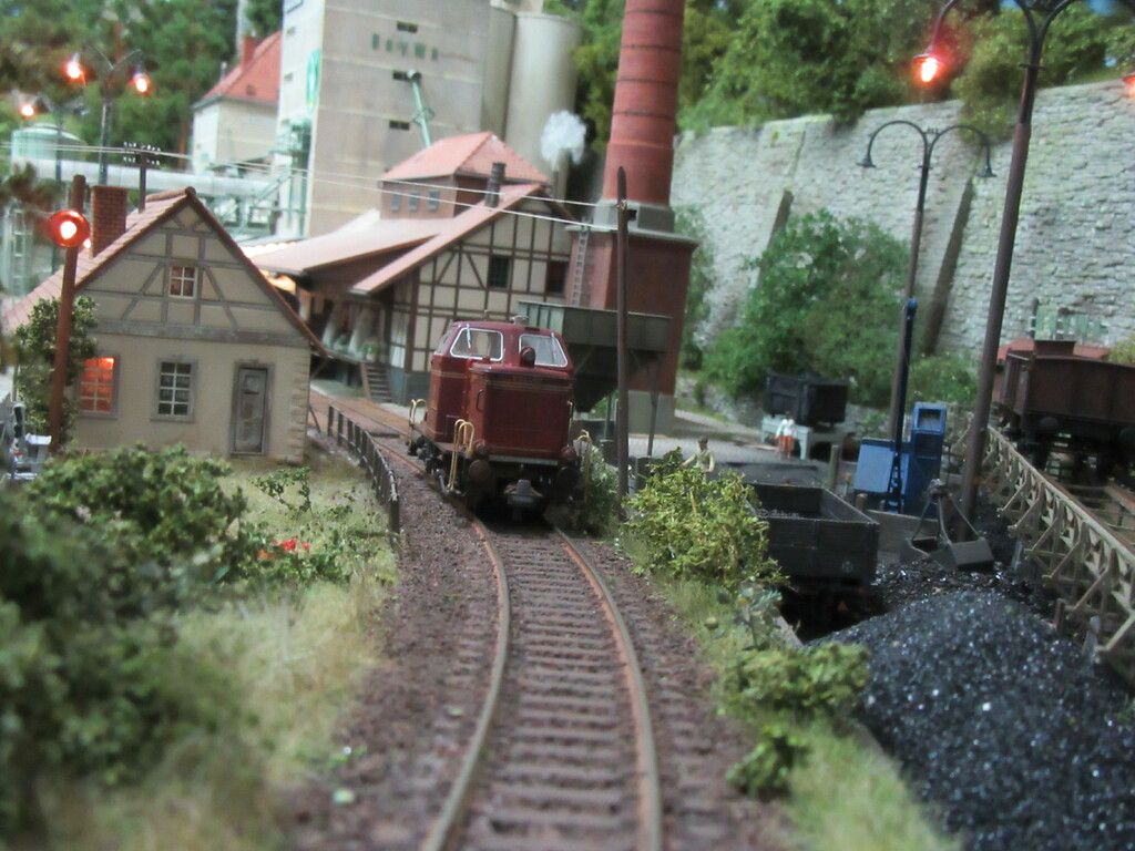 Nachdem die Ziegel endlich aus dem Gleis geschafft wurden holt Zirkelborn seine Lok mit dem angehängten Topfwagen und setzt den R Wagen ins Nachbargleis um. Nun kann der Säuretopfwagen für die Farbenfabrik Becolin zugestellt werden.