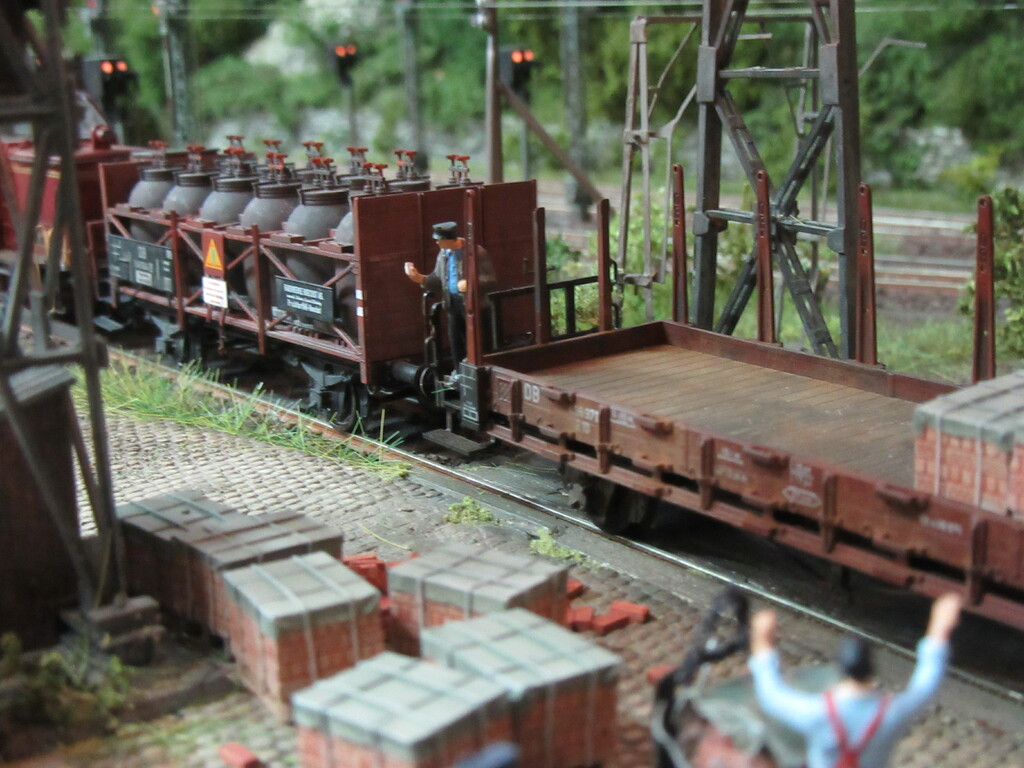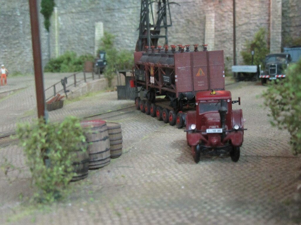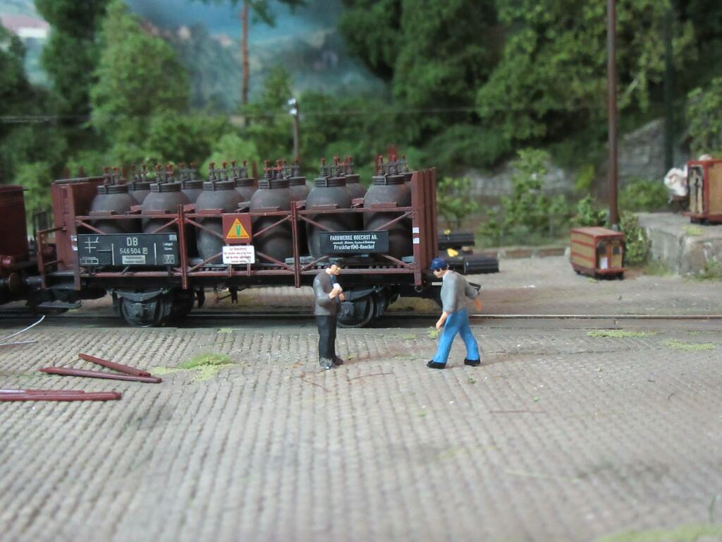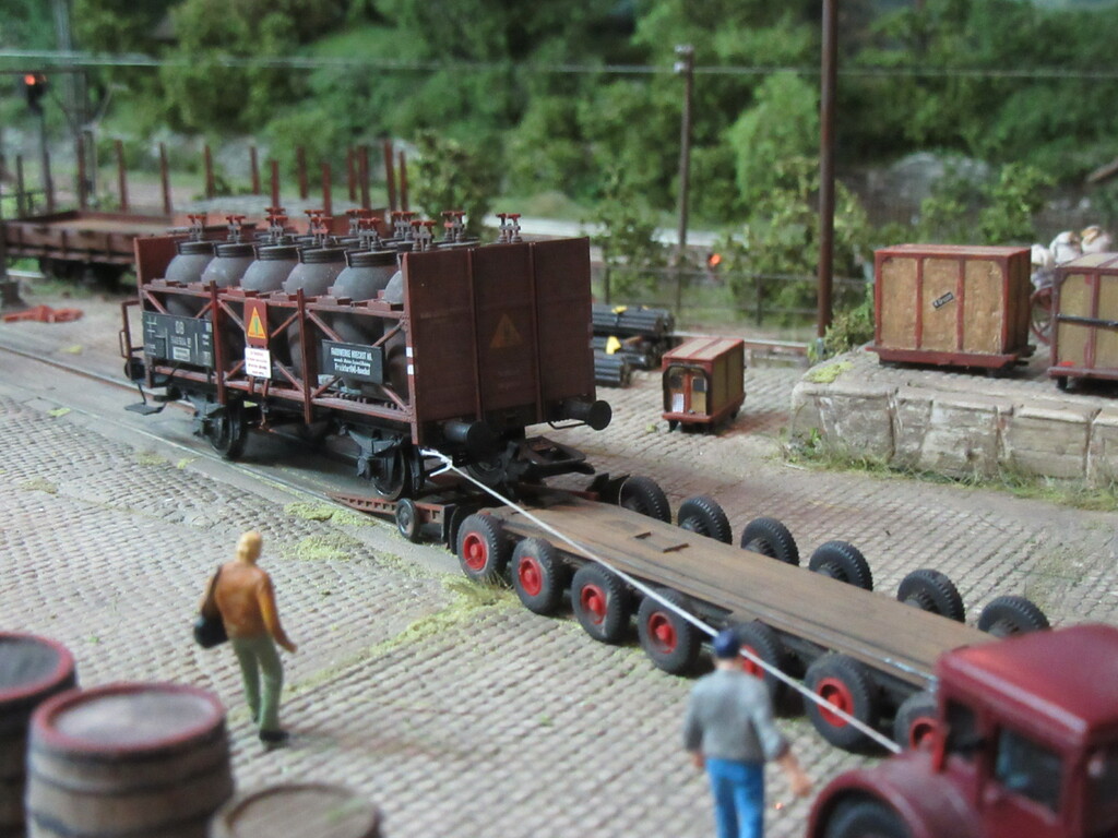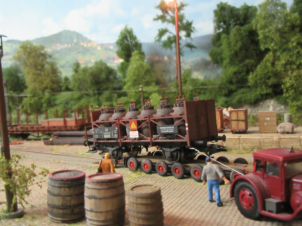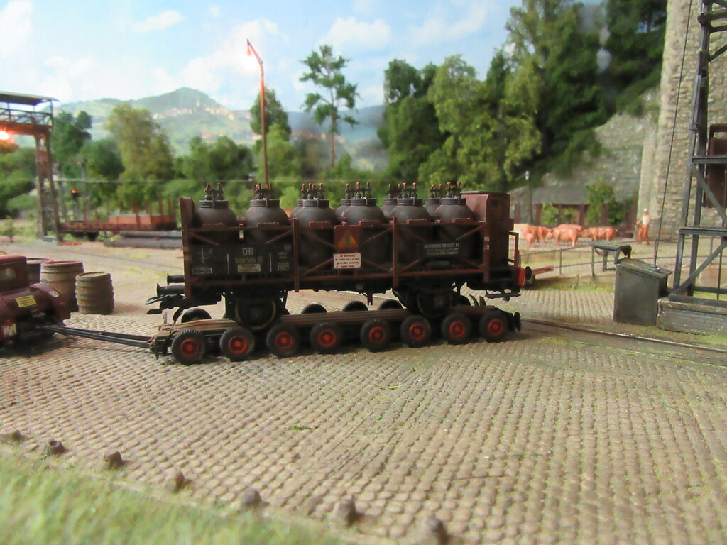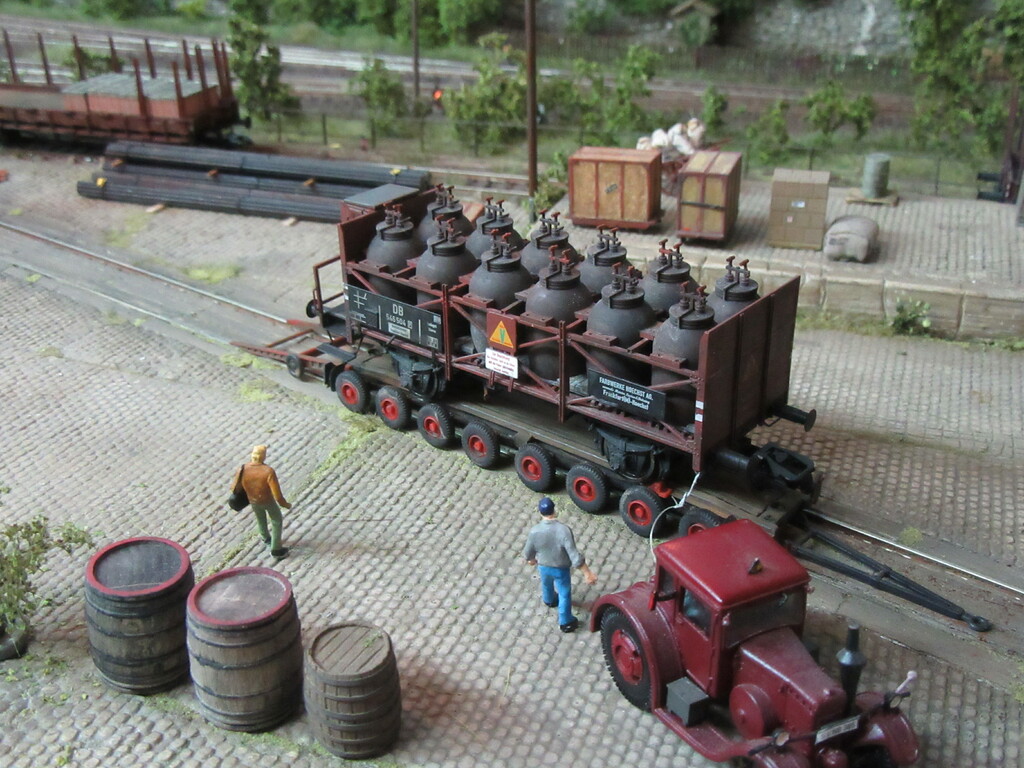Hallo Florian und wieder Willkommen in Neustadt. Der Säuretopfwagen ist von Brawa und natürlich von mir verunstaltet.Als erstes gab es einen Überzug mit mattem Klarlack. Dann wurden mit dem Farbkasten mal die Töpfe dunkelbraun bemalt. Neben dem Überzug mit Schmuddelbrühe an Fahrwerk und Aufbau,habe ich versucht die Töpfe etwas mit Pigmentfarben (Weisser Schmutz Asoa)