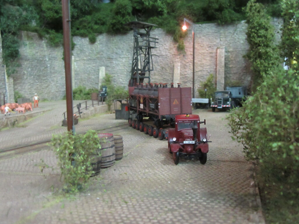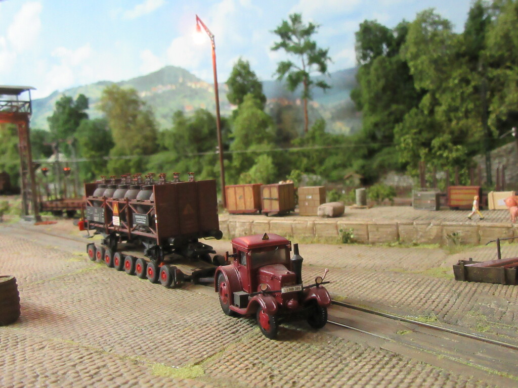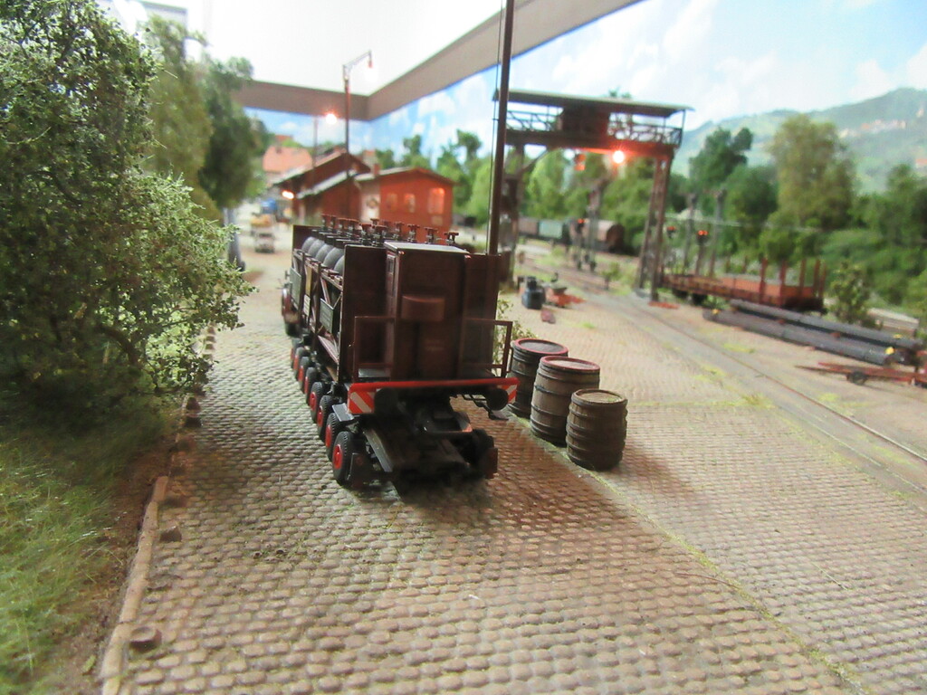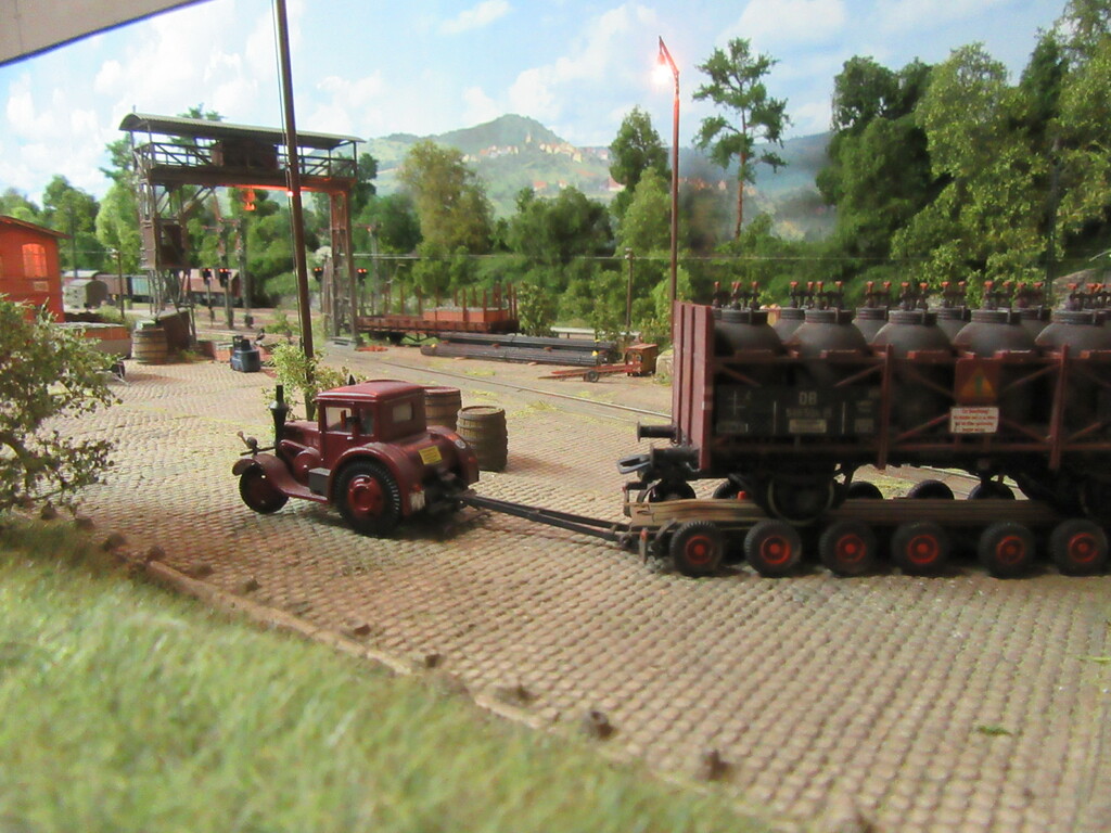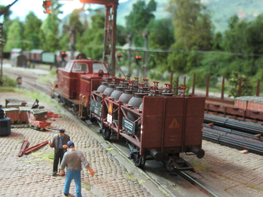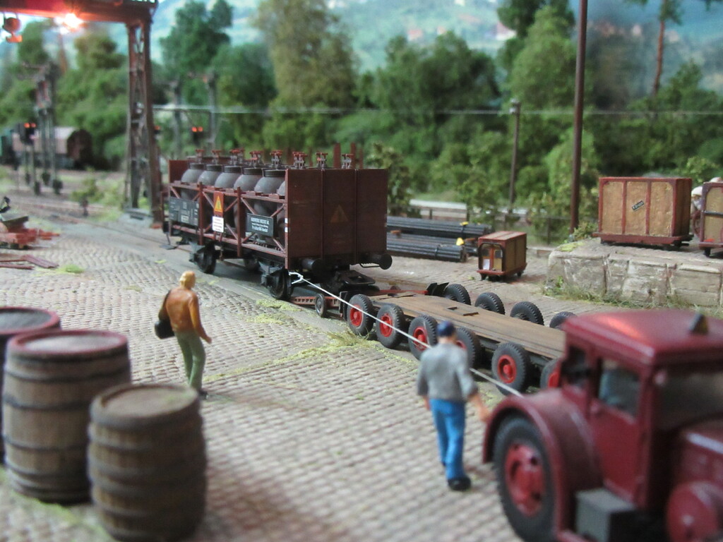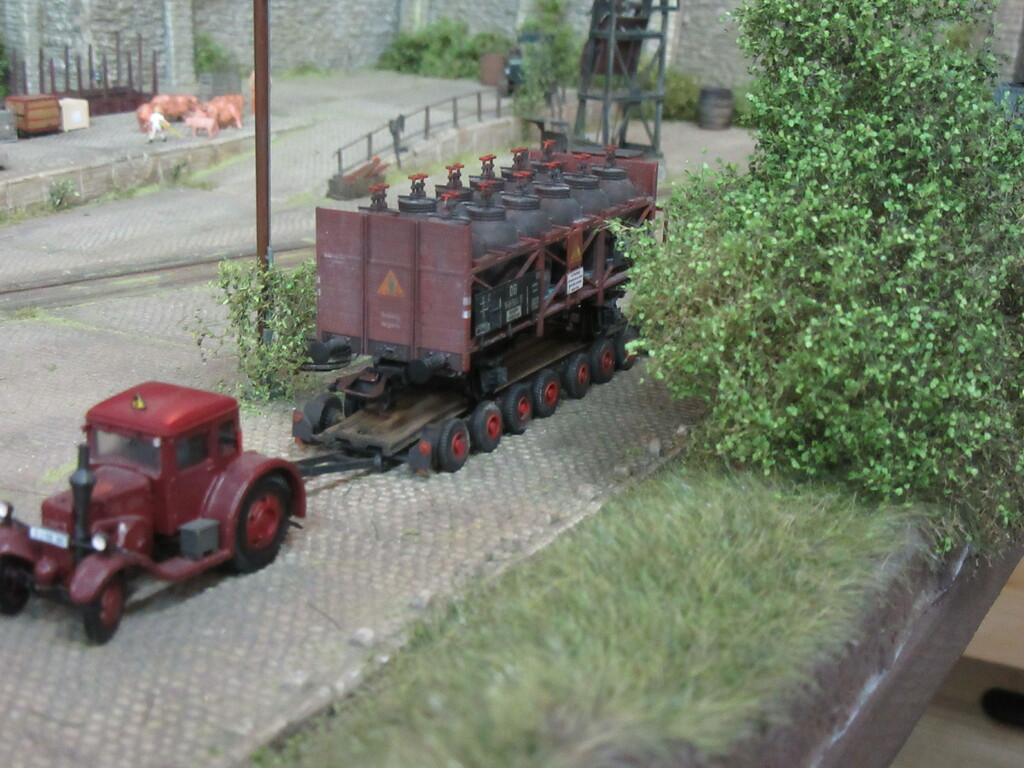 Hallo Florian und wieder Willkommen in Neustadt. Der Säuretopfwagen ist von Brawa und natürlich von mir verunstaltet.Als erstes gab es einen Überzug mit mattem Klarlack. Dann wurden mit dem Farbkasten mal die Töpfe dunkelbraun bemalt. Neben dem Überzug mit Schmuddelbrühe an Fahrwerk und Aufbau,habe ich versucht die Töpfe etwas mit Pigmentfarben (Weisser Schmutz Asoa)
