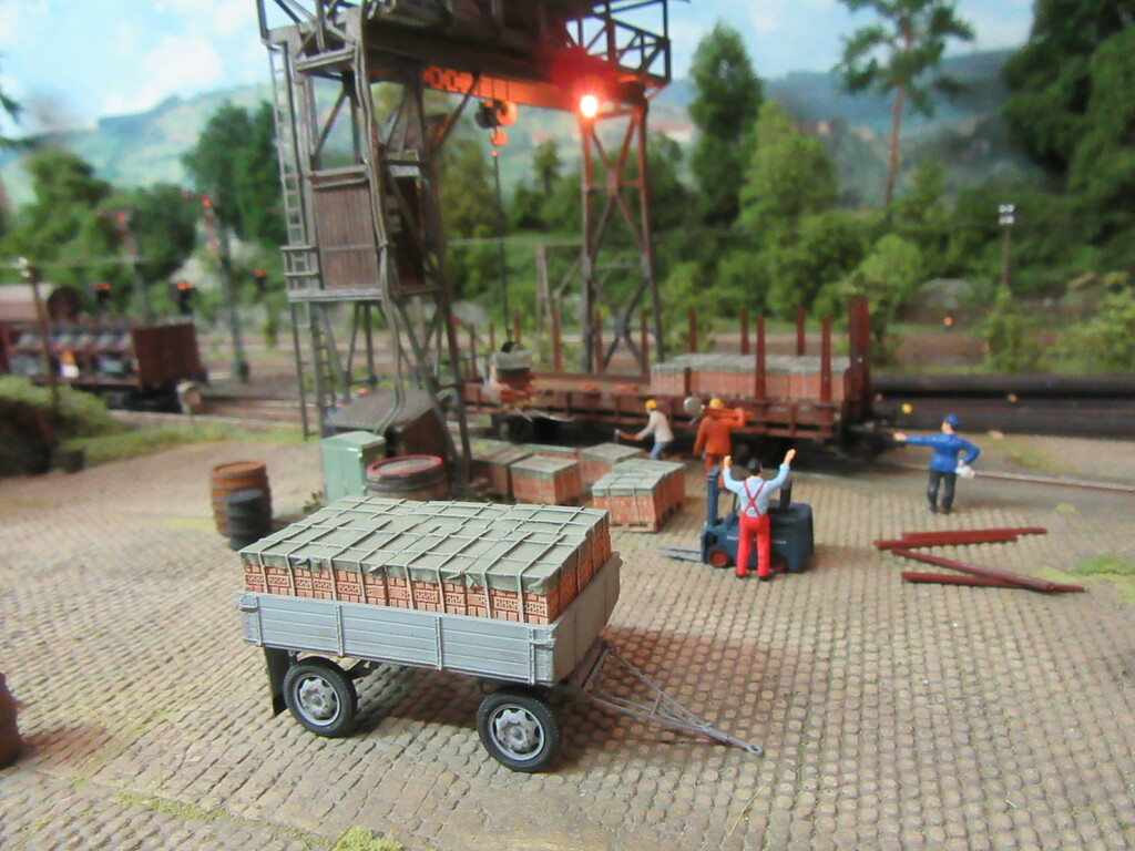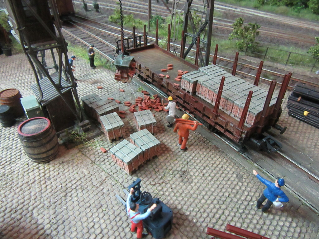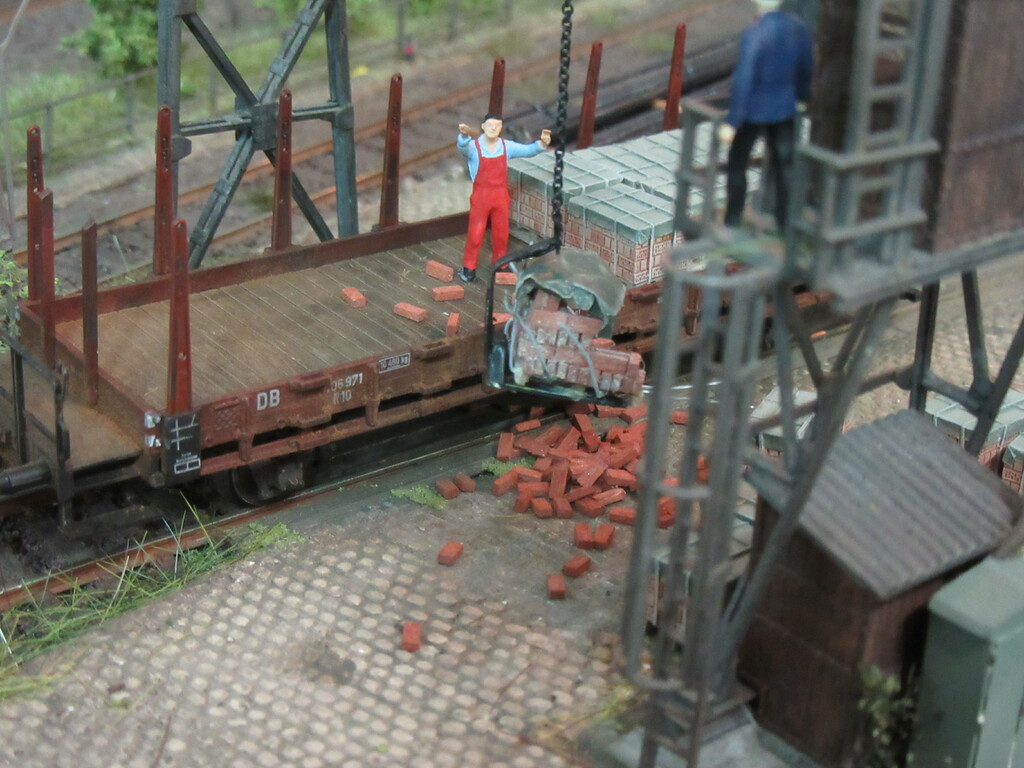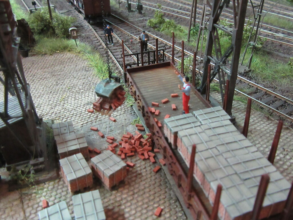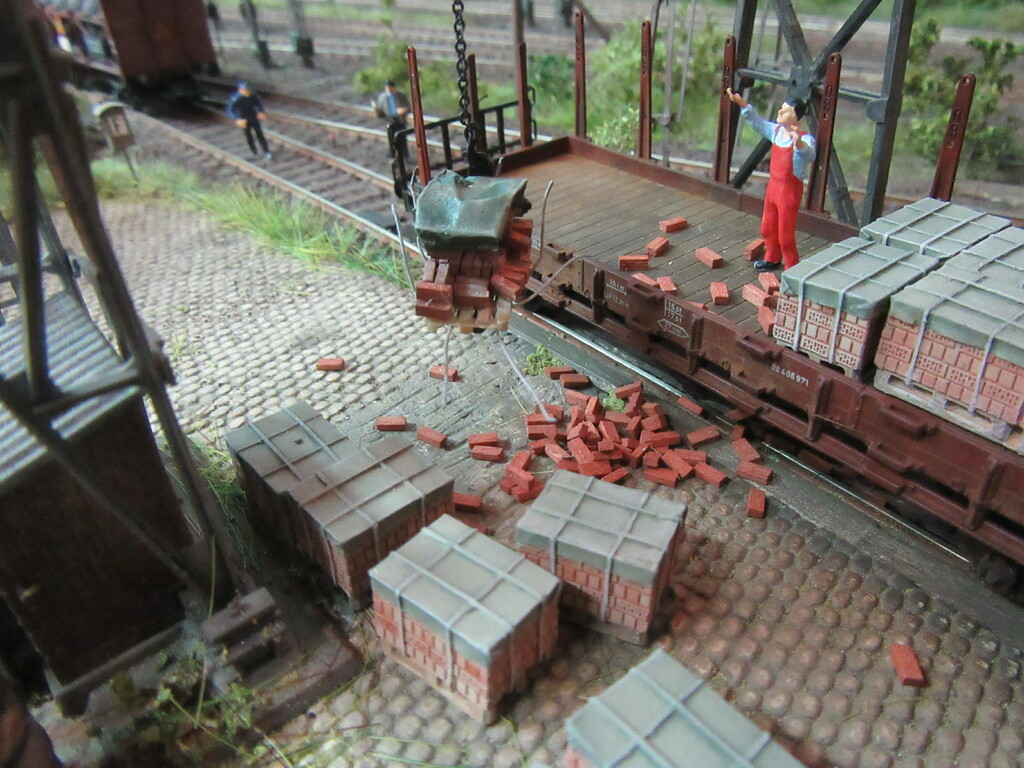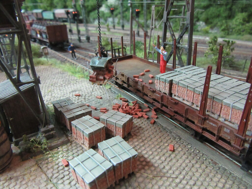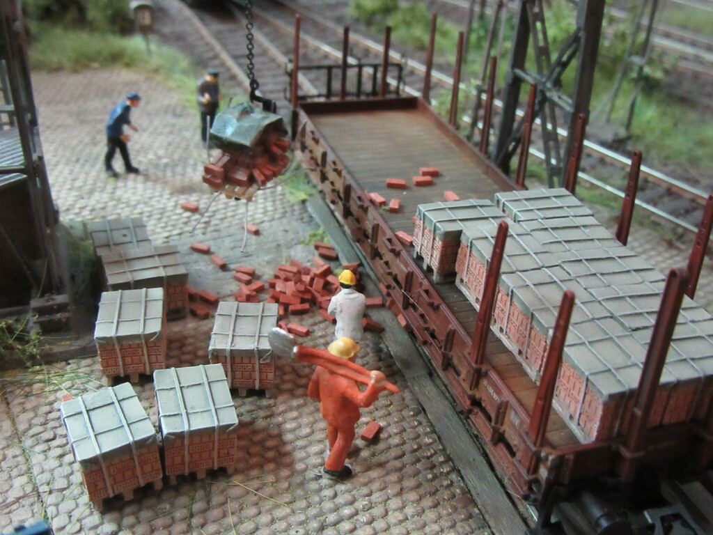 Unter dem Kran werden gerade Ziegel verladen in einen R Wagen. Die Ziegel sind auf Paletten gestapelt.(Anmerkung: Es sind zwar noch keine Europaletten,die kommen erst in den 1960ern.Aber einfache ungenormte Paletten gibt es schon seit Ende des Krieges)