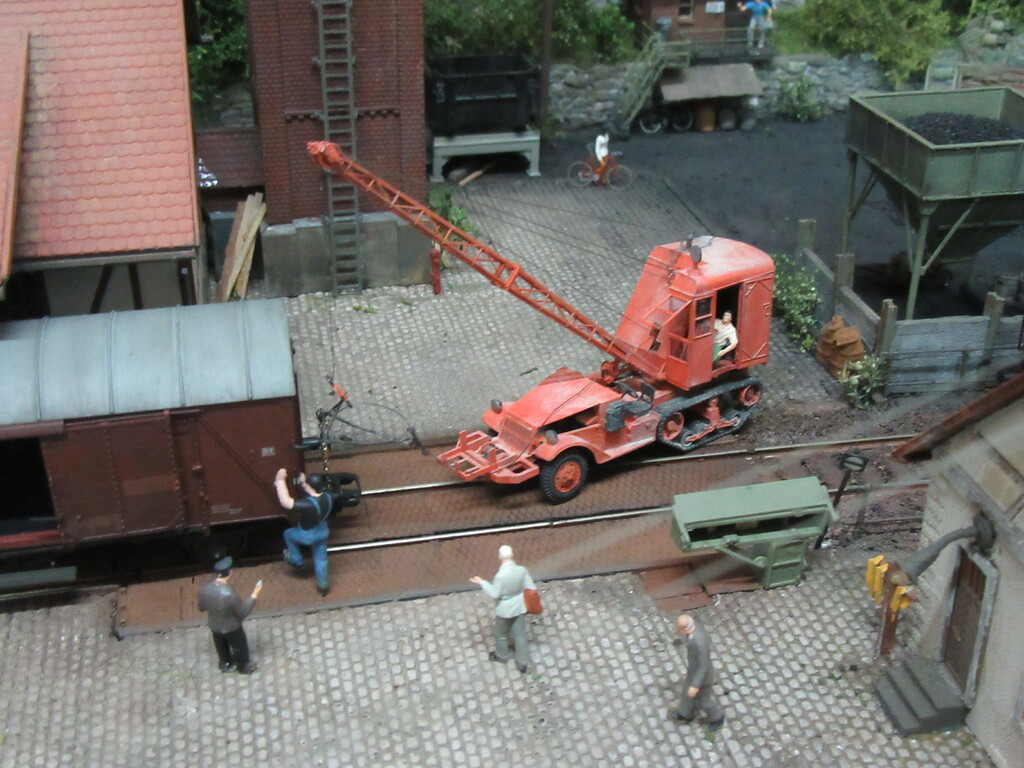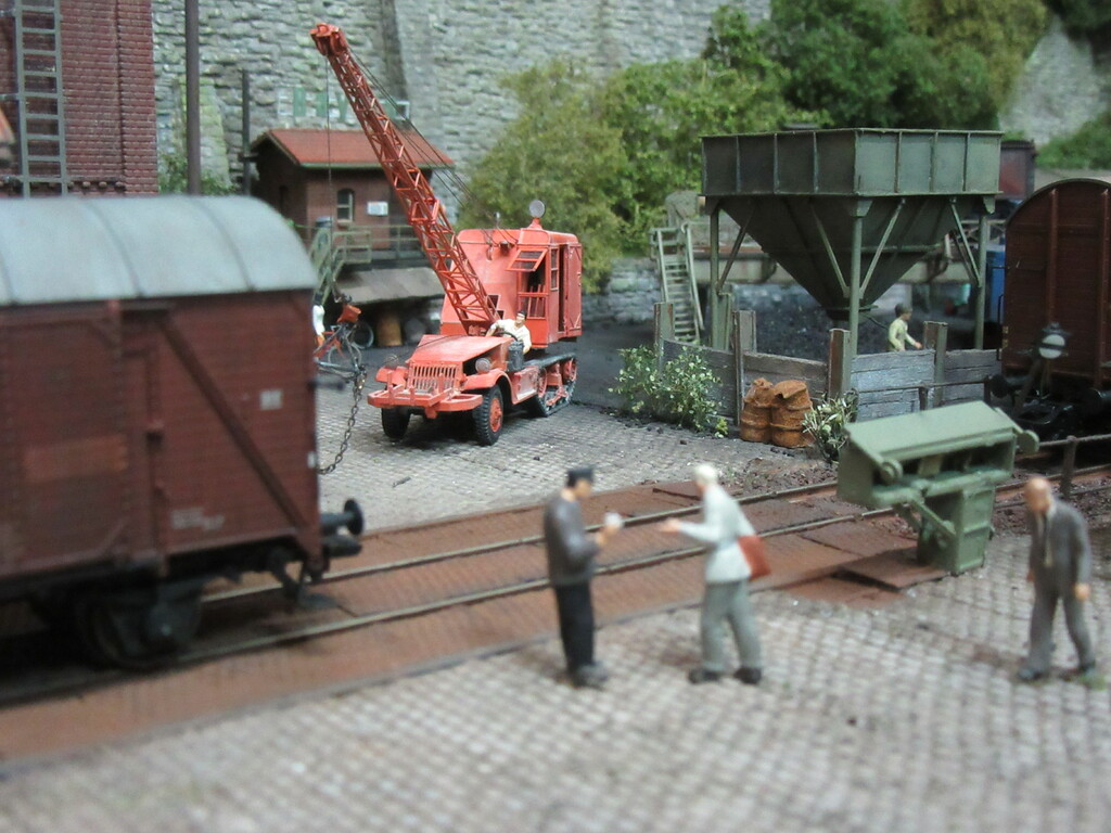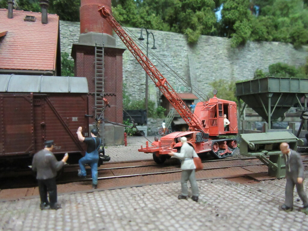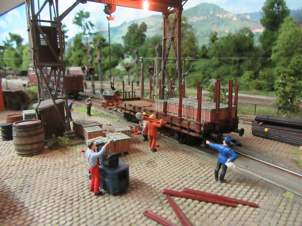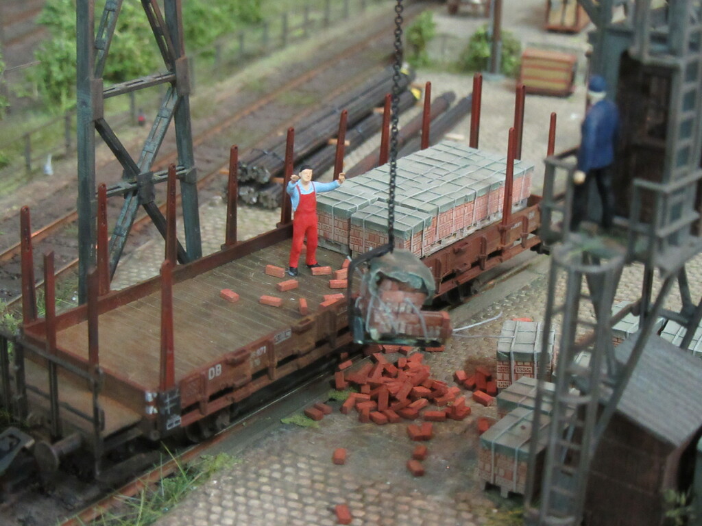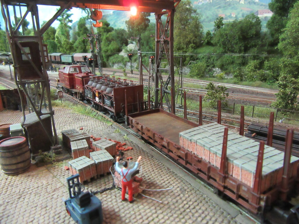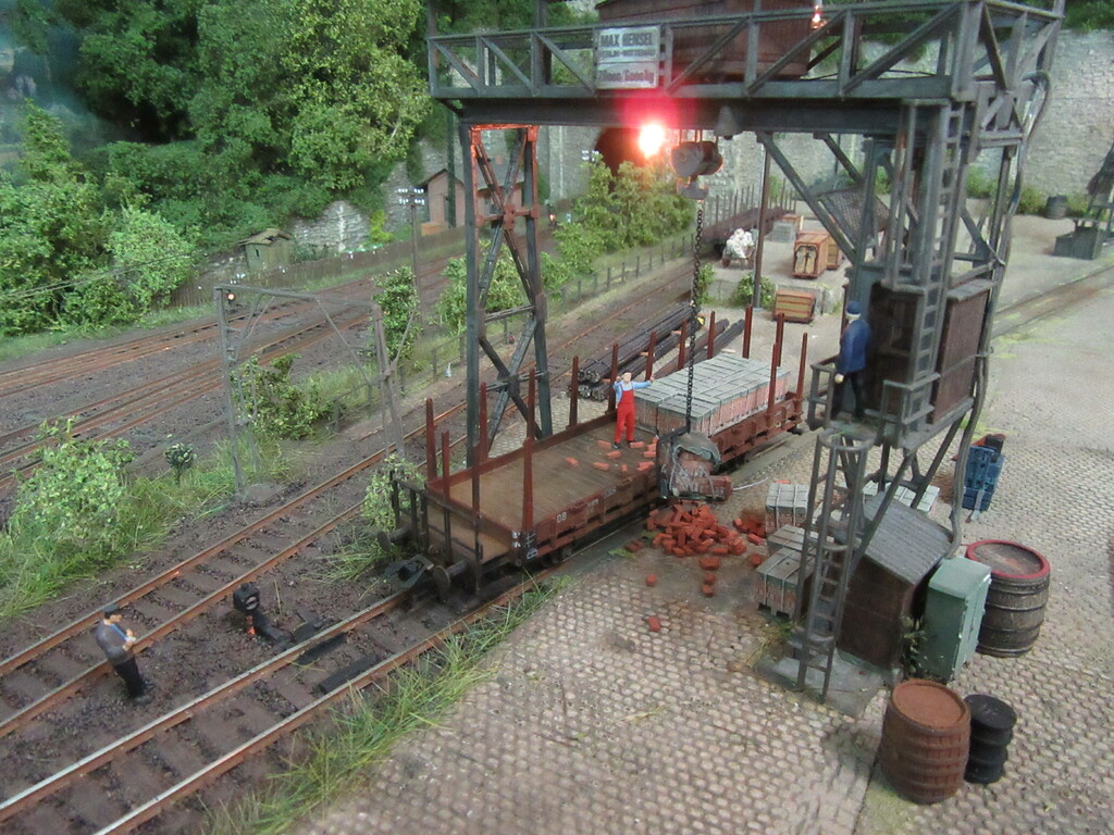 Unter dem Kran werden gerade Ziegel verladen in einen R Wagen. Die Ziegel sind auf Paletten gestapelt.(Anmerkung: Es sind zwar noch keine Europaletten,die kommen erst in den 1960ern.Aber einfache ungenormte Paletten gibt es schon seit Ende des Krieges)