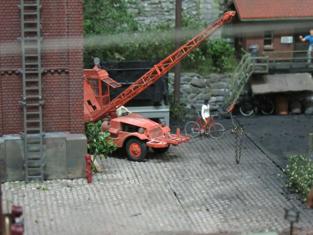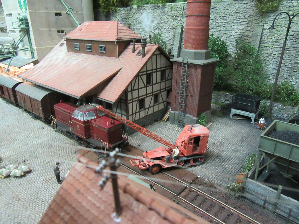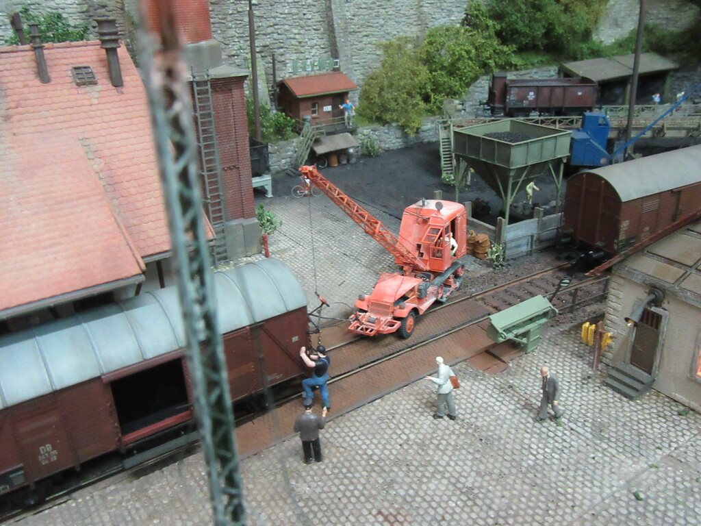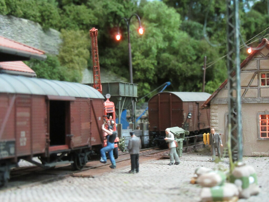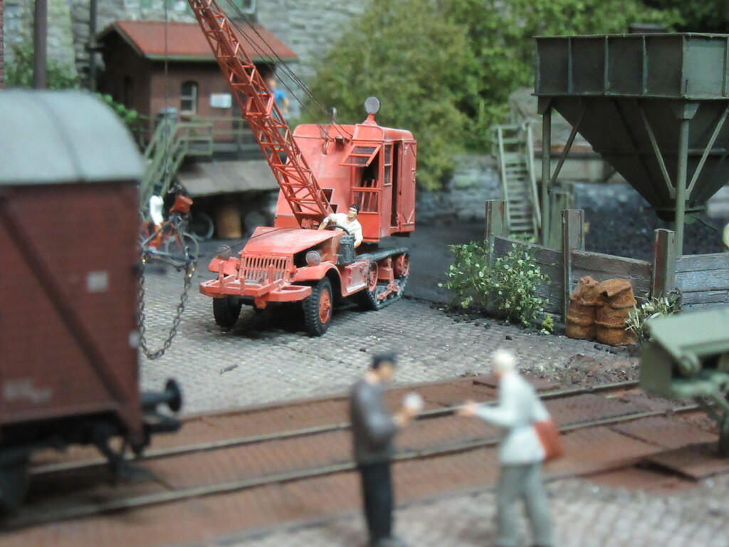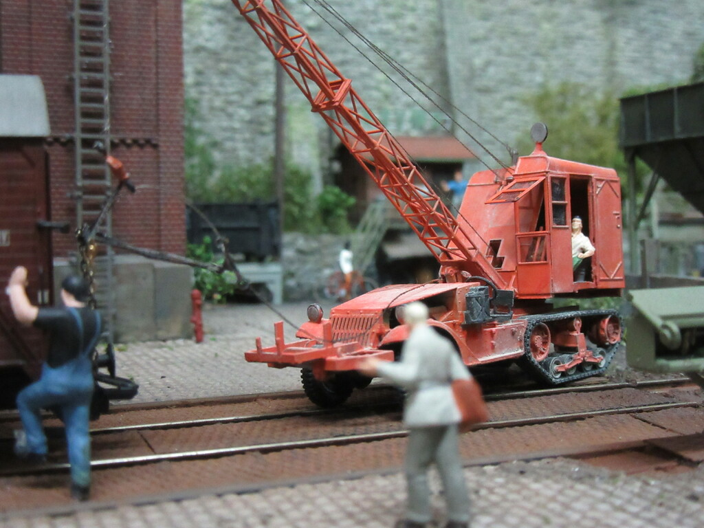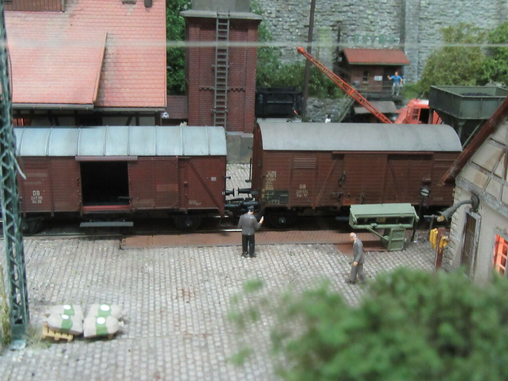 Unter dem Kran werden gerade Ziegel verladen in einen R Wagen. Die Ziegel sind auf Paletten gestapelt.(Anmerkung: Es sind zwar noch keine Europaletten,die kommen erst in den 1960ern.Aber einfache ungenormte Paletten gibt es schon seit Ende des Krieges)