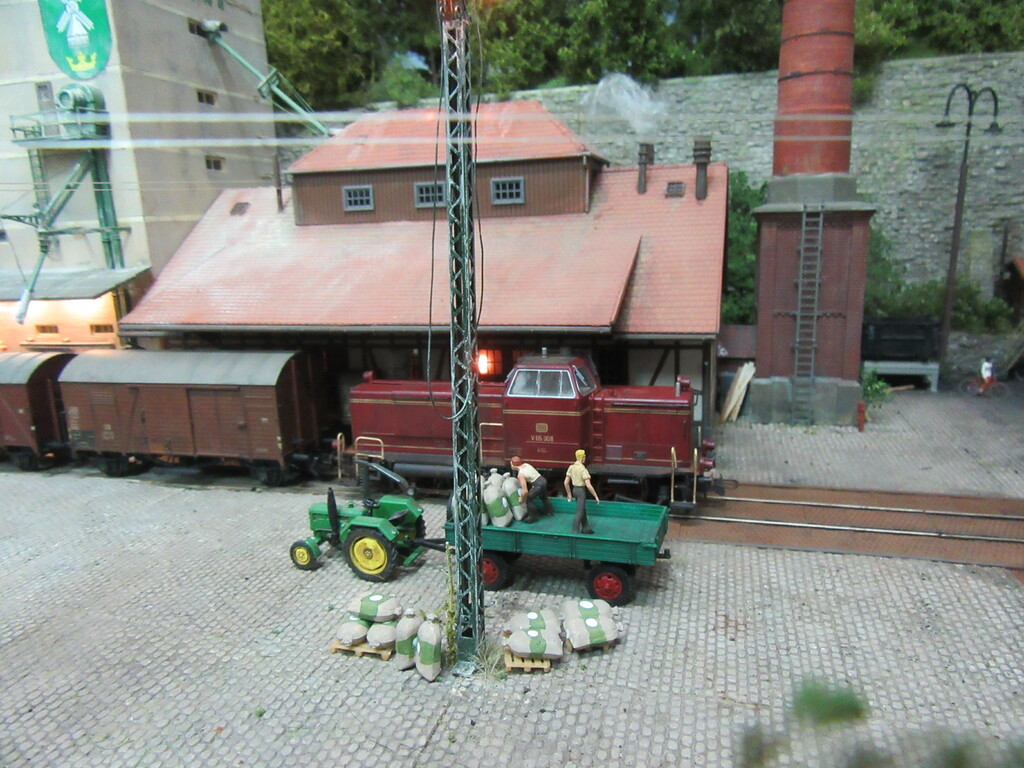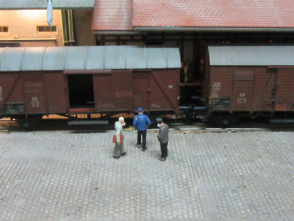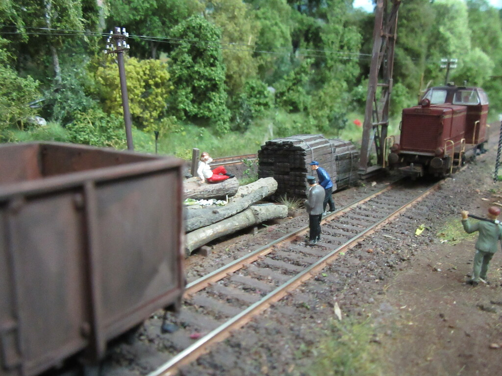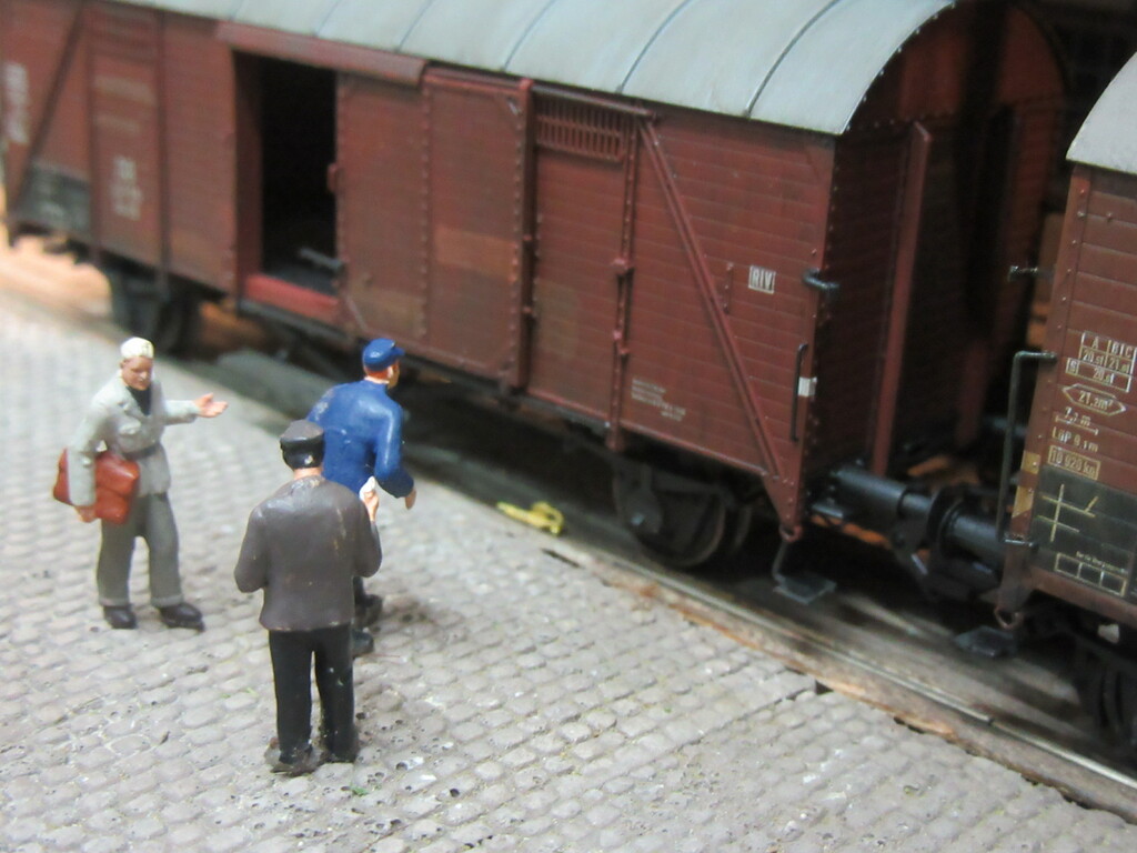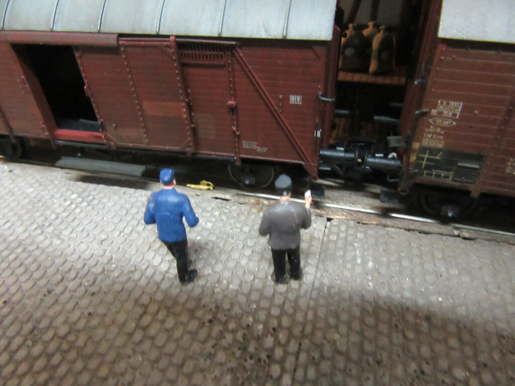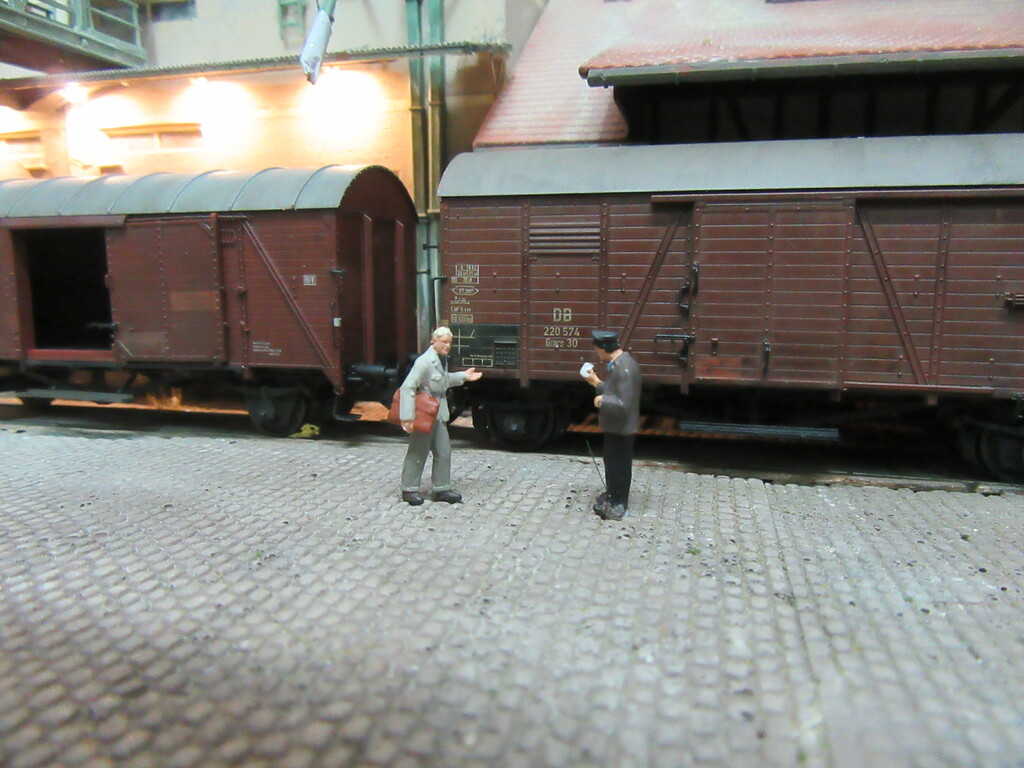 Der R Wagen war ja eigentlich nur eins der „Hindernisse“beim Rangieren der beiden; um genauer zu sein die Tatsache das ein Ziegelpacken geborsten und unter den Wagen ins Gleis gefallen war. Da wurde also aufgeräumt und die Verlader waren dann fort, aus frust erst mal einen Kaffee trinken.