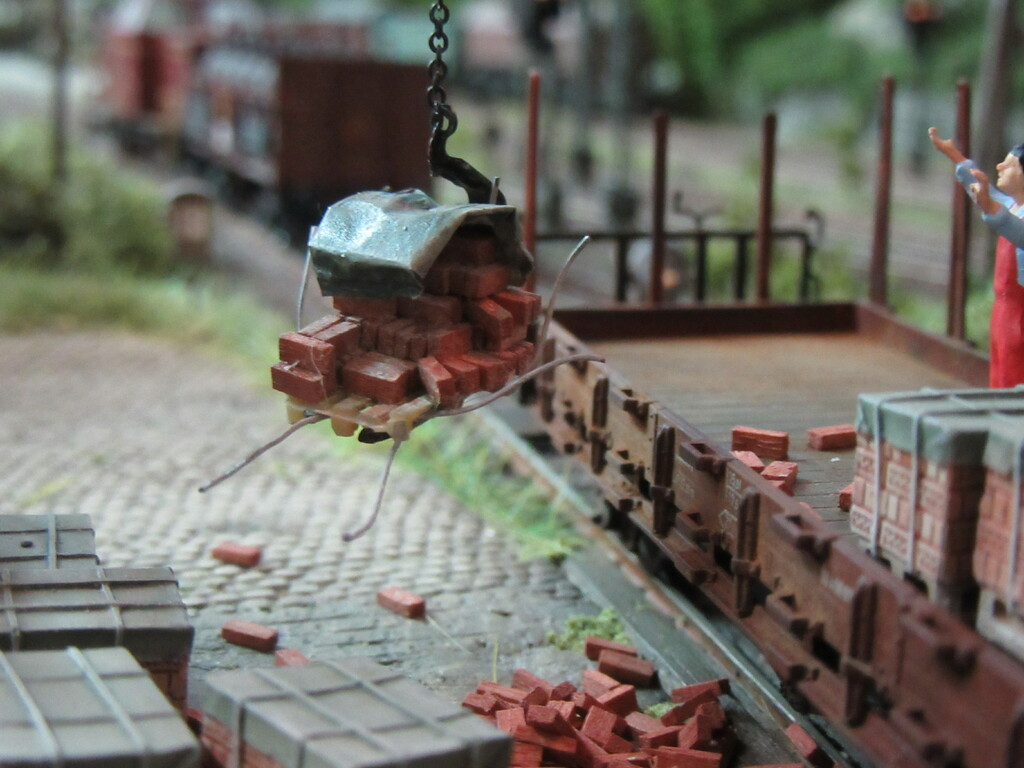 Die Paletten mit den Ziegeln sind per Anhänger und Trecker angeliefert worden und mit einem kleinen Clark Stapler abgeladen und unter den Kran gesetzt worden. Der Kran soll sie nun flächig verteilt mit einer Gabel auf den R Wagen setzen. So weit so gut und das hat auch schon ein paar mal geklappt,wie wir auf dem R Wagen sehen können.