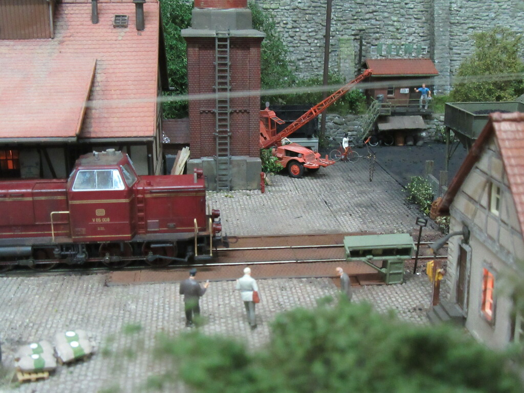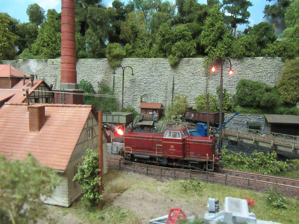 Wir sehen unsere Lok wie sie wieder auf Gleis 1 angekommen ist. Die DKW wird gestellt und die V65 läuft langsam in Richtung Südmühle.