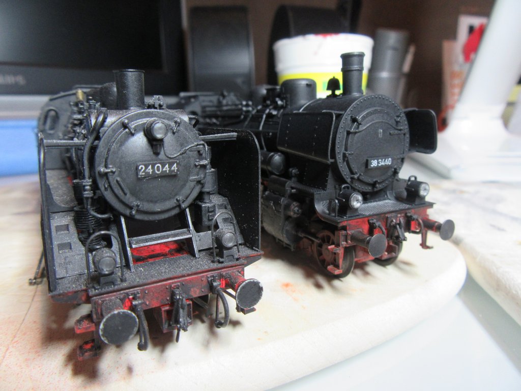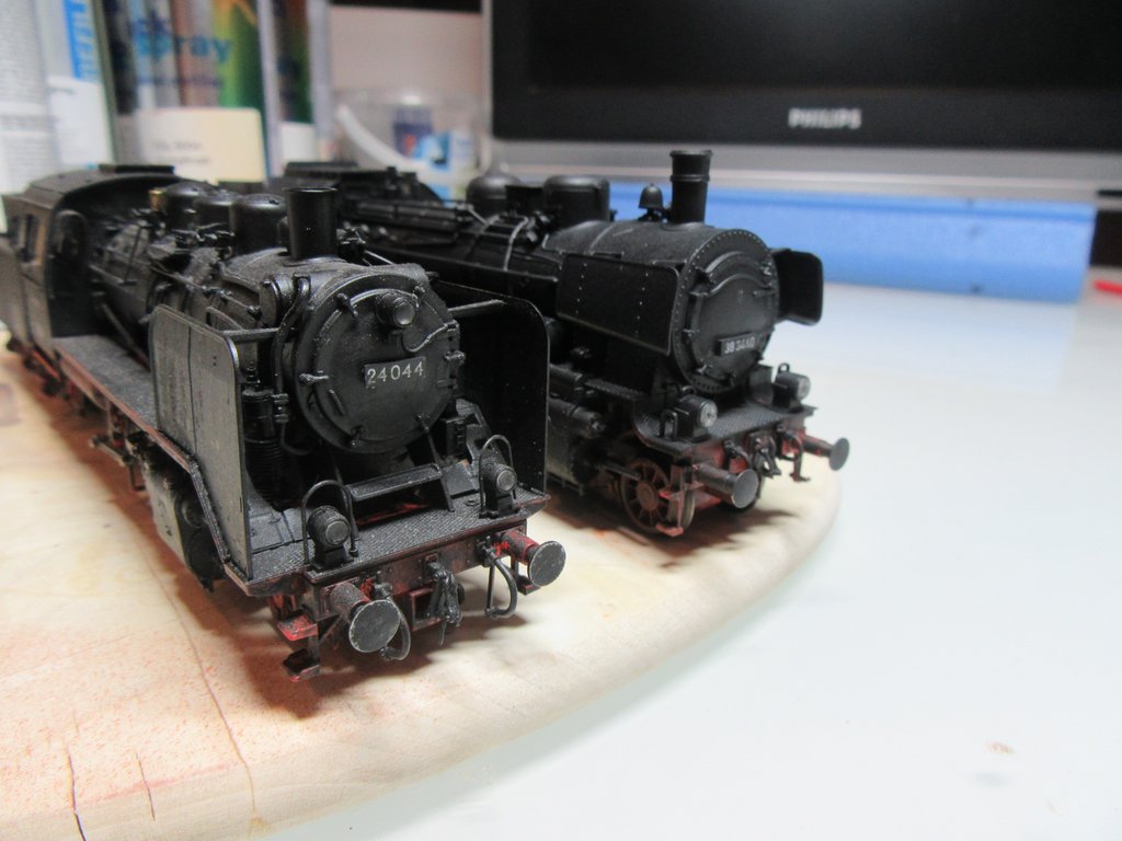 Bei den Loks erfolgt der Farbauftrag ohne Grundierung. Die Farbe des Farbkastens (schwarz, schwarzbraun) trocknet völlig matt auf. Danach wird die Lok mit Mattlack überzogen, weil man eine Lok schon mal öfter anfasst und begrapscht. Auch wenn hier stumpfmatter Klarlack aufgetragen wird ,gibt dieser der Lok etwas an Glanz zurück und es entsteht ein schönes Finish.